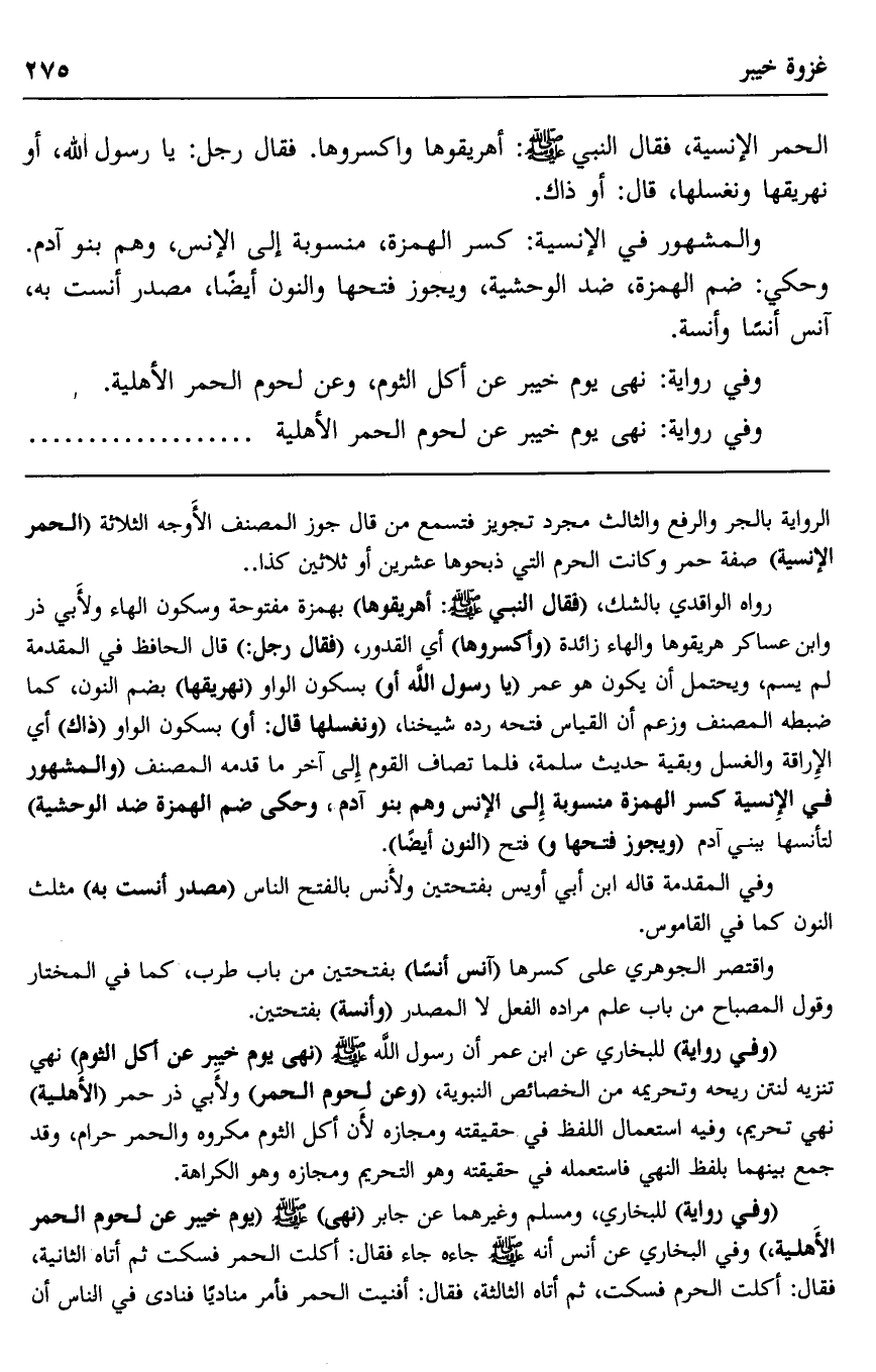 الحمر الإنسية، فقال النبي صلى الله عليه وسلم: "أهريقوها واكسروها". فقال رجل: يا رسول الله، أو نهريقها ونغسلها، قال: "أو ذاك".