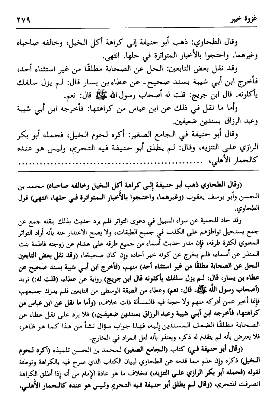 وقال الطحاوي: ذهب أبو حنيفة إلى كراهة أكل الخيل، وخالفه صاحباه وغيرهما, واحتجوا بالأخبار المتواترة في حلها. انتهى.