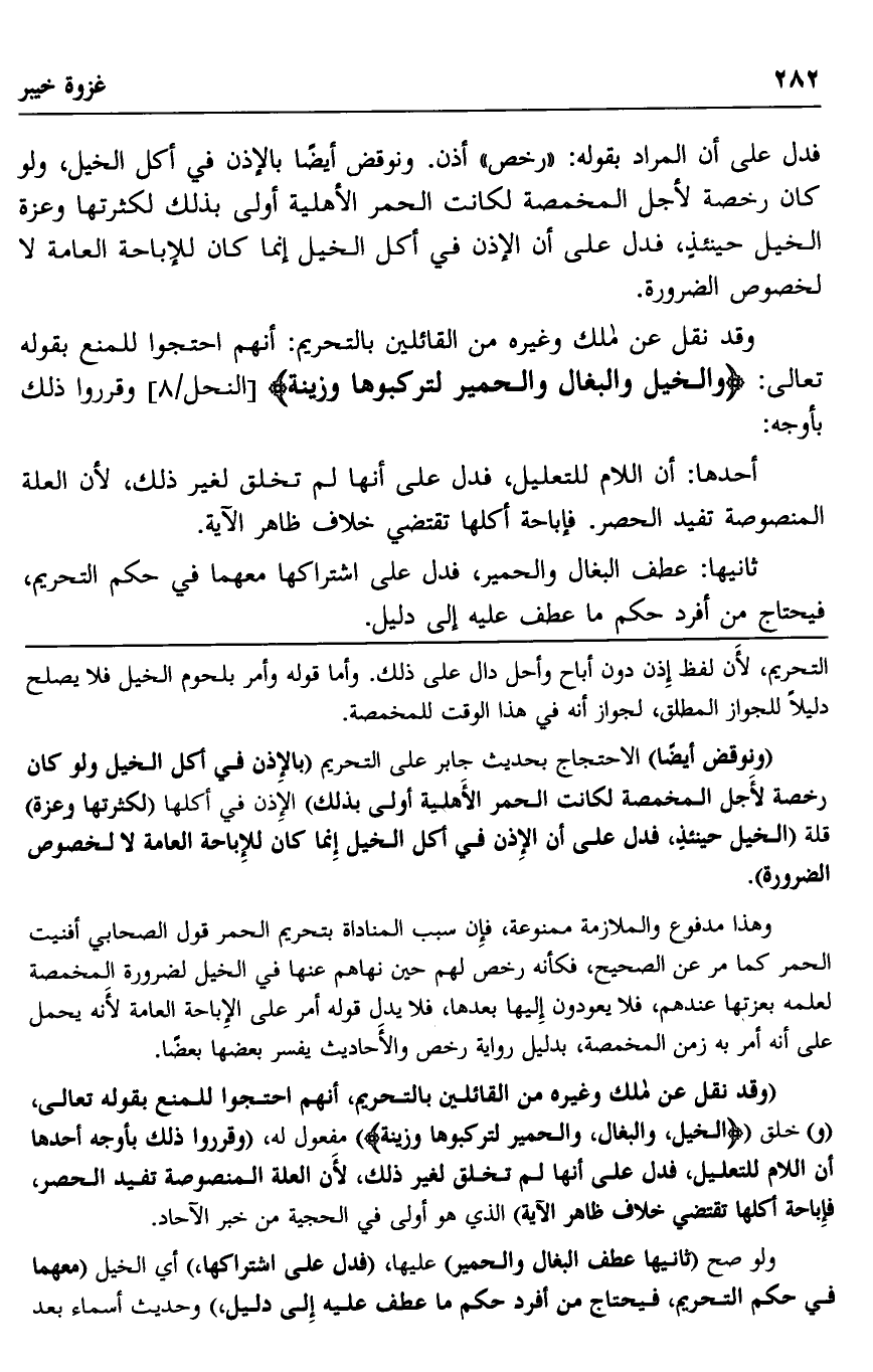 "وقد نقل عن مالك وغيره من القائلين بالتحريم، أنهم احتجوا للمنع بقوله تعالى: "و" خلق {الْخَيْلَ وَالْبِغَالَ وَالْحَمِيرَ لِتَرْكَبُوهَا وَزِينَةً} مفعول له، "وقرروا ذلك بأوجه أحدها أن اللام للتعليل، فدل على أنها لم تخلق لغير ذلك؛ لأن العلة المنصوصة تفيد الحصر، فإباحة أكلها تقتضي خلاف ظاهر الآية" الذي هو أولى في الحجية من خبر الآحاد.