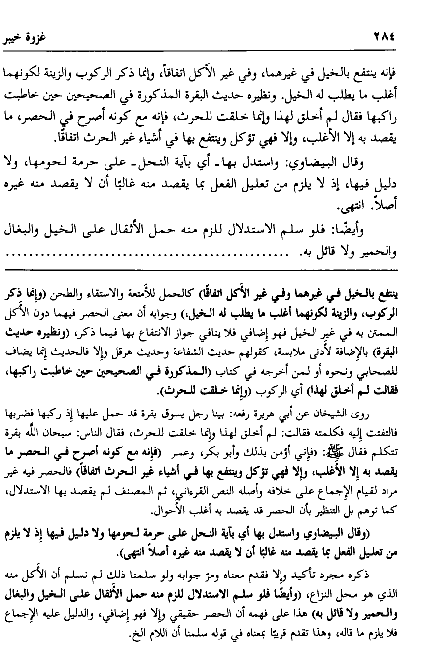 ينتفع بالخيل في غيرهما وفي غير الأكل اتفاقا" كالحمل للأمتعة والاستقاء والطحن "وإنما ذكر الركوب، والزينة لكونهما أغلب ما يطلب له الخيل،" وجوابه أن معنى الحصر فيهما دون الأكل الممتن به في غير الخيل فهو إضافي فلا ينافي جواز الانتفاع بها فيما ذكر، "ونظيره حديث البقرة بالإضافة لأدنى ملابسة، كقولهم حديث الشفاعة وحديث هرقل وإلا فالحديث إنما يضاف للصحابي ونحوه أو لمن أخرجه في كتاب. "المذكورة في الصحيحين حين خاطبت راكبها، فقالت: لم أخلق لهذا" أي الركوب "وإنما خلقت للحرث".