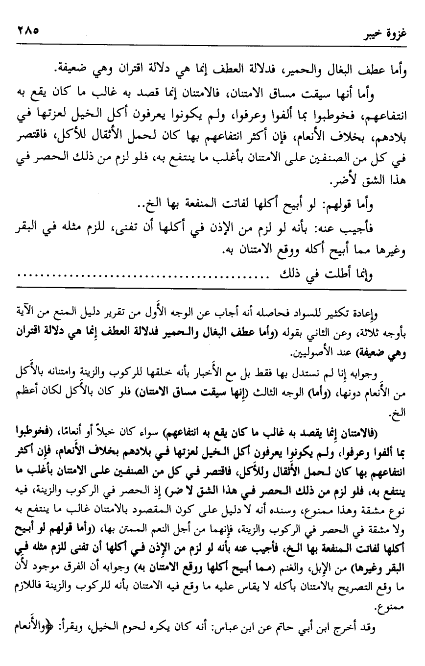 وإعادة تكثير للسواد فحاصله أنه أجاب عن الوجه الأول من تقرير دليل المنع من الآية بأوجه ثلاثة، وعن الثاني بقوله "وأما عطف البغال والحمير فدلالة العطف إنما هي دلالة اقتران وهي ضعيفة" عند الأصوليين.