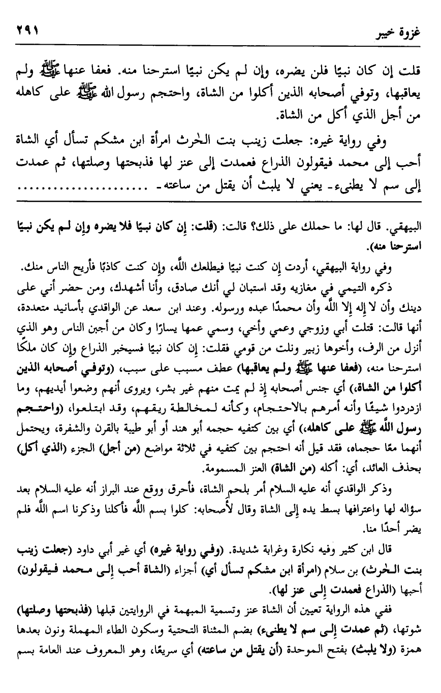 قلت إن كان نبيا فلن يضره، وإن لم يكن نبيا استرحنا منه. فعفا عنها صلى الله عليه وسلم ولم يعاقبها، وتوفي أصحابه الذين أكلوا من الشاة، واحتجم رسول الله صلى الله عليه وسلم على كاهله من أجل الذي أكل من الشاة.