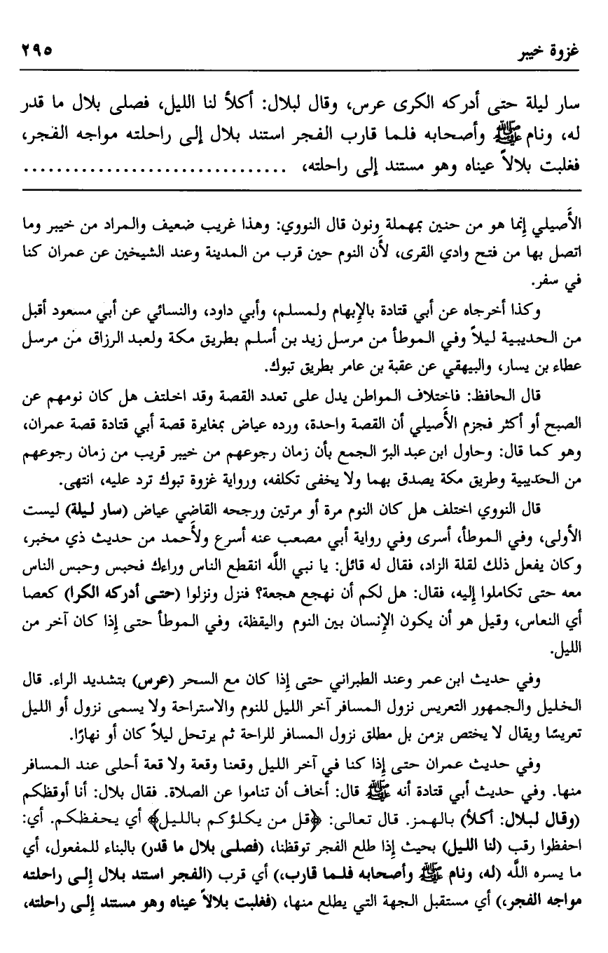 قال النووي اختلف: هل كان النوم مرة أو مرتين؟ ورجحه القاضي عياض "سار ليلة" ليست الأولى، وفي الموطأ: أسرى, وفي رواية أبي مصعب عنه: أسرع, ولأحمد من حديث ذي مخبر، وكان يفعل ذلك لقلة الزاد، فقال له قائل: يا نبي الله انقطع الناس وراءك فحبس وحبس الناس معه حتى تكاملوا إليه، فقال: "هل لكم أن نهجع هجعة"؟. فنزل ونزلوا "حتى أدركه الكرا" كعصا أي: النعاس, وقيل: هو أن يكون الإنسان بين النوم واليقظة، وفي الموطأ: حتى إذا كان آخر من الليل.