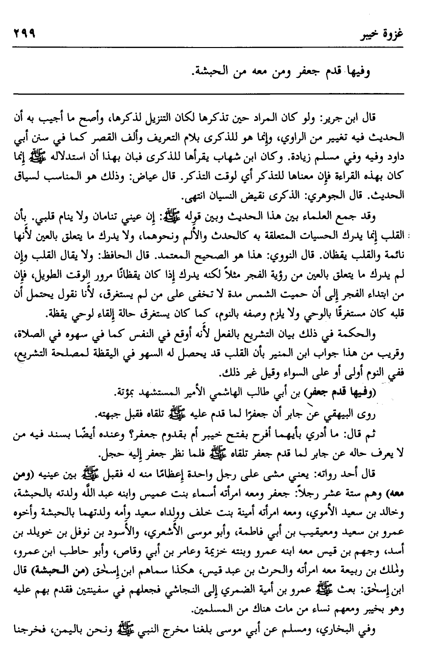 قال أحد رواته: يعني مشى على رجل واحدة إعظاما منه له فقبل صلى الله عليه وسلم بين عينيه "ومن معه" وهم ستة عشر رجلا، جعفر ومعه امرأته أسماء بنت عميس وابنه عبد الله ولدته بالحبشة، وخالد بن سعيد الأموي، مع امرأته أمينة بنت خلف وولداه سعيد وأمية ولدتهما بالحبشة وأخوه عمرو بن سعيد, ومعيقيب بن أبي فاطمة، وأبو موسى الأشعري، والأسود بن نوفل بن خويلد بن أسد، وجهم بن قيس معه ابنه عمرو وبنته خزيمة, وعامر بن أبي وقاص، وأبو حاطب ابن عمرو، ومالك بن ربيعة معه امرأته, والحارث بن عبد قيس، هكذا سماهم ابن إسحاق "من الحبشة" قال ابن إسحاق: بعث صلى الله عليه وسلم عمرو بن أمية الضمري إلى النجاشي فجعلهم في سفينتين فقدم بهم عليه وهو بخيبر ومعهم نساء من مات هناك من المسلمين.