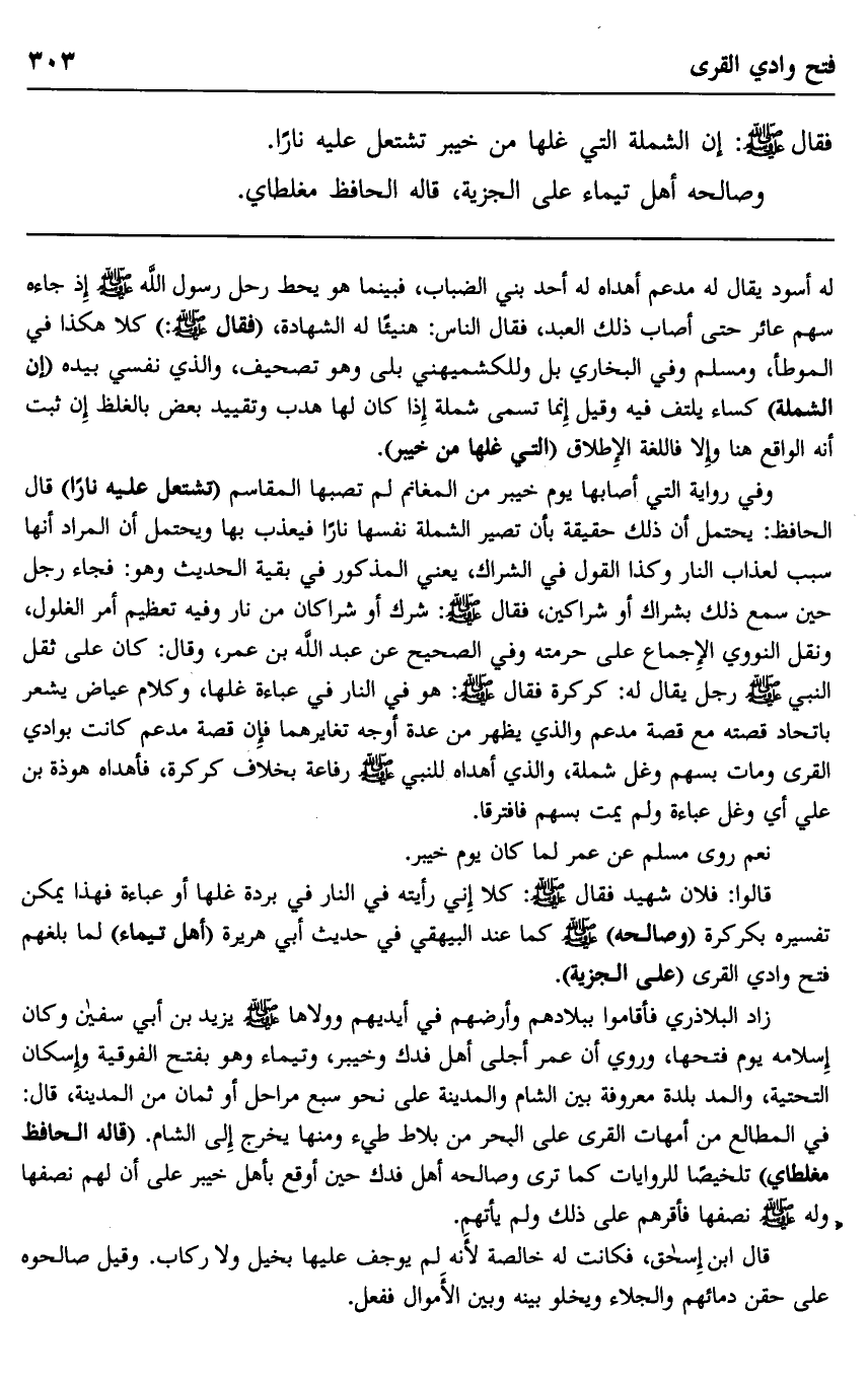 قالوا: فلان شهيد, فقال صلى الله عليه وسلم: "كلا إني رأيته في النار في بردة غلها -أو عباءة-". فهذا يمكن تفسيره بكركرة "وصالحه" صلى الله عليه وسلم كما عند البيهقي في حديث أبي هريرة "أهل تيماء" لما بلغهم فتح وادي القرى "على الجزية".