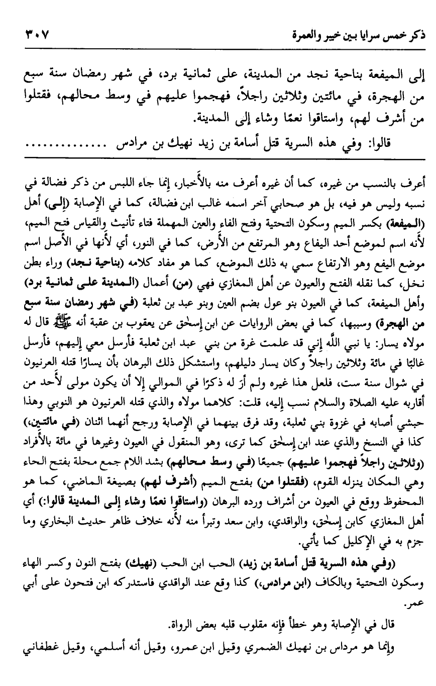 "وفي هذه السرية قتل أسامة بن زيد" الحب ابن الحب "نهيك" بفتح النون وكسر الهاء وسكون التحتية وبالكاف "ابن مرداس", كذا وقع عند الواقدي فاستدركه ابن فتحون على أبي عمر.