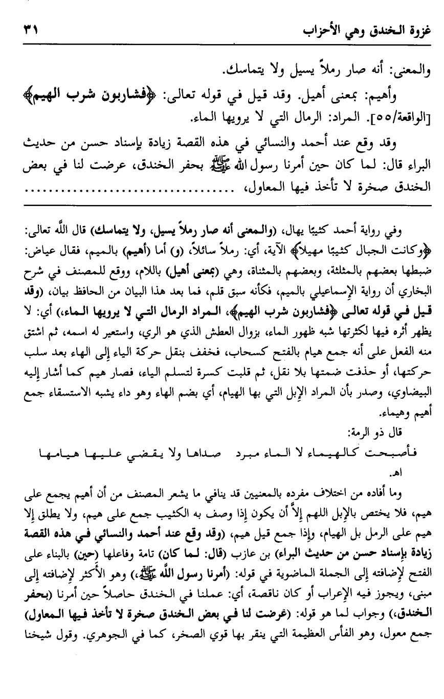 وما أفاده من اختلاف مفرده بالمعنيين قد ينافي ما يشعر المصنف من ن أهيم يجمع على هيم، فلا يختص بالإبل اللهم إلا أن يكون إذا وصف به الكثيب جمع على هيم، ولا يطلق إلا هيم على الرمل بل الهيام، وإذا جمع قيل هيم، و"قد وقع عند أحمد والنسائي في هذه القصة زيادة بإسناد حسن من حديث البراء" بن عازب "قال: لما كان" تامة وفاعلها "حين" بالبناء على الفتح لإضافته إلى الجملة الماضوية في قوله: "أمرنا رسول الله صلى الله عليه وسلم" وهو الأكثر لإضافته إلى مبني، ويجوز فيه الإعراب أو كان ناقصة، أي: عملنا في الخندق حاصلا حين أمرنا "بحفر الخندق"، وجواب لما هو قوله: "عرضت لنا في بعض الخندق صخرة لا تأخذ فيها المعاول" جمع معول، وهو الفأس العظيمة التي ينقر بها قوي الصخر، كما في الجوهري. وقول شيخنا