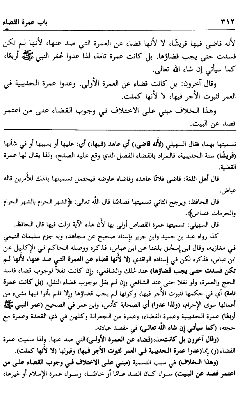 "وقال آخرون: بل كانت هذه "قضاء عن العمرة الأولى" التي صد عنها, ولذا سميت عمرة القضاء "و" إنما "عدوا عمرة الحديبية في العمر لثبوت الأجر فيها" وقبولها "لا لأنها كملت".
