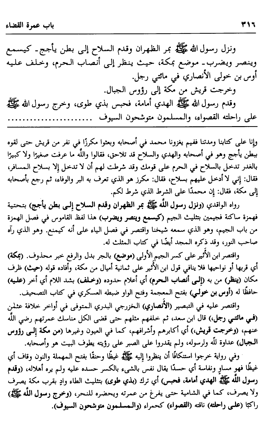 وقدم رسول الله صلى الله عليه وسلم الهدي أمامه، فحبس بذي طوى، وخرج رسول الله صلى الله عليه وسلم على راحلته القصواء، والمسلمون متوشحون السيوف