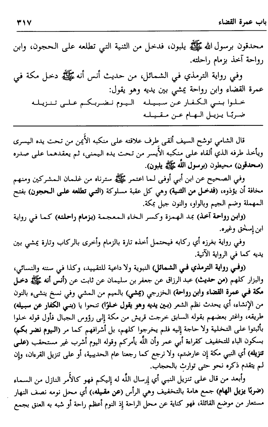 وفي رواية الترمذي في الشمائل، من حديث أنس أنه صلى الله عليه وسلم دخل مكة في عمرة القضاء وابن رواحة يمشي بين يديه وهو يقول: