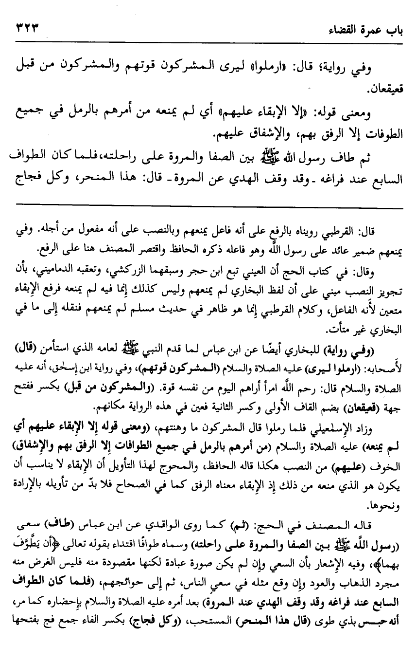 ومعنى قوله: "إلا الإبقاء عليهم" أي لم يمنعه من أمرهم بالرمل في جميع الطوفات إلا الرفق بهم، والإشفاق عليهم.