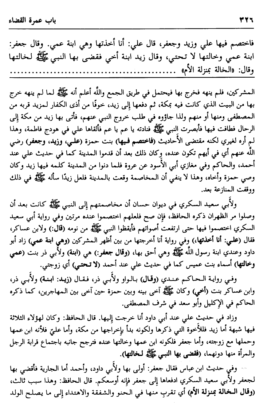 فاختصم فيها علي وزيد وجعفر، قال علي: أنا أخذتها وهي ابنة عمي. وقال جعفر: ابنة عمي وخالتها تحتي، وقال زيد: ابنة أخي فقضى بها النبي صلى الله عليه وسلم لخالتها وقال: "الخالة بمنزلة الأم". الحديث.