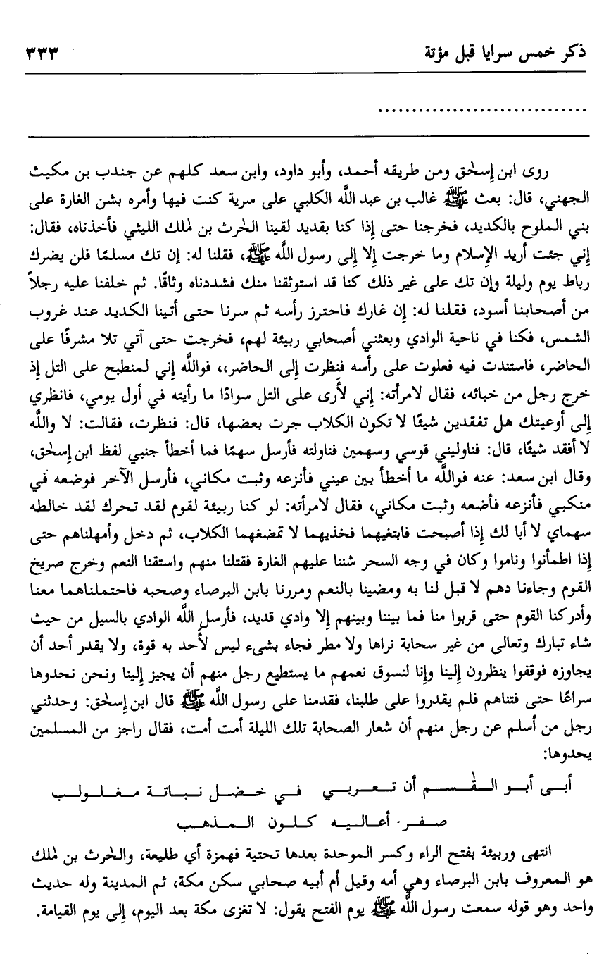 روى ابن إسحاق ومن طريقه أحمد، وأبو داود، وابن سعد كلهم عن جندب بن مكيث الجهني، قال: بعث صلى الله عليه وسلم غالب بن عبد الله الكلبي على سرية كنت فيها وأمره بشن الغارة على بني الملوح بالكديد، فخرجنا حتى إذا كنا بقديد لقينا الحارث بن مالك الليثي فأخذناه، فقال: إني جئت أريد الإسلام وما خرجت إلا إلى رسول الله صلى الله عليه وسلم، قلنا له: إن تك مسلما فلن يضرك رباط يوم وليلة وإن تك على غير ذلك كنا قد استوثقنا منك فشددناه وثاقا. ثم خلفنا عليه رجلا من أصحابنا أسود، فقلنا له: إن غارك فاحتز رأسه. ثم سرنا حتى أتينا الكديد عند غروب الشمس، فكنا في ناحية الوادي وبعثني أصحابي ربيئة لهم، فخرجت حتى آتي تلا مشرفا على الحاضر، فاستندت فيه فعلوت على رأسه فنظرت إلى الحاضر، فوالله إني لمنبطح على التل إذ خرج رجل من خبائه، فقال لامرأته: إني لأرى على التل سوادا ما رأيته في أول يومي، فانظري إلى أوعيتك هل تفقدين شيئا لا تكون الكلاب جرت بعضها، قال: فنظرت، فقالت: لا والله لا أفقد شيئا، قال: فناوليني قوسي وسهمين فناولته فأرسل سهما فما أخطأ جنبي. لفظ ابن إسحاق: وقال ابن سعد: عنه فوالله ما أخطأ بين عيني فأنزعه وثبت مكاني، فأرسل الآخر فوضعه في منكبي فأنزعه فأضعه وثبت مكاني، فقال لامرأته: لو كنا ربيئة لقوم لقد تحرك لقد خالطه سهماي لا أبا لك إذا أصبحت فابتغيهما فخذيهما لا تمضغهما الكلاب، ثم دخل وأمهلناهم حتى إذا اطمأنوا وناموا وكان في وجه السحر شننا عليهم الغارة فقتلنا منهم واستقنا النعم وخرج صريخ القوم وجاءنا دهم لا قبل لنا به ومضينا بالنعم ومررنا بابن البرصاء وصحبه فاحتملناهما معنا وأدركنا القوم حتى قربوا منا فما بيننا وبينهم إلا وادي قديد، فأرسل الله الوادي بالسيل من حيث شاء تبارك وتعالى من غير سحابة نراها ولا مطر فجاء بشيء ليس لأحد به قوة، ولا يقدر أحد أن يجاوزه فوقفوا ينظرون إلينا وإن لنسوق نعمهم ما يستطيع رجل منهم أن يجيز إلينا ونحن نحدوها سراعا حتى فتناهم فلم يقدروا على طلبنا، فقدمنا على رسول الله صلى الله عليه وسلم. قال ابن إسحاق: وحدثني رجل من أسلم عن رجل منهم أن شعار الصحابة تلك الليلة: أمت أمت. فقال راجز من المسلمين يحدوها: