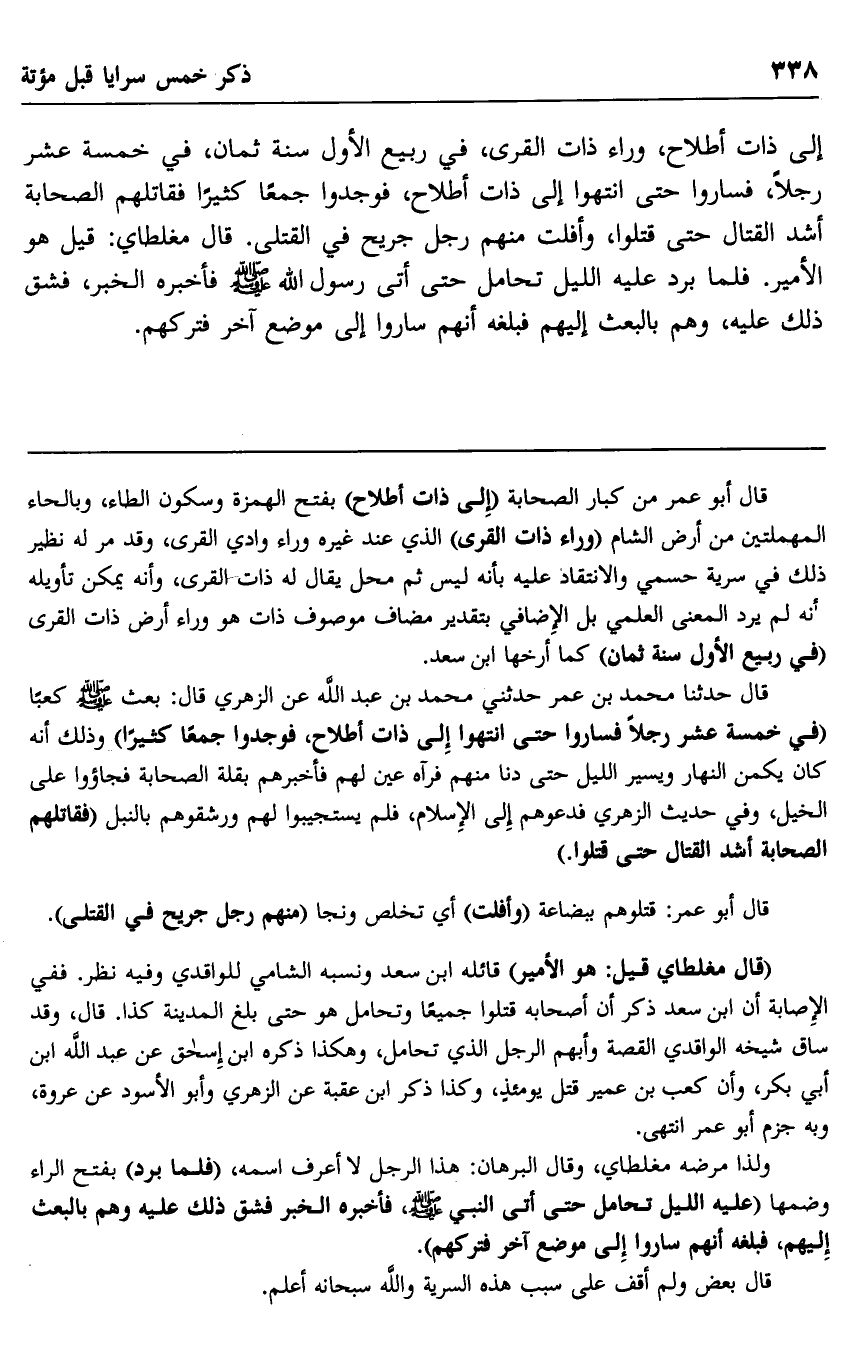 قال أبو عمر من كبار الصحابة "إلى ذات أطلاح" بفتح الهمزة وسكون الطاء، وبالحاء المهملتين من أرض الشام "وراء ذات القرى" الذي عند غيره: وراء وادي القرى، وقد مر له نظير ذلك في سرية حسمي والانتقاد عليه بأنه ليس ثم محل يقال له: ذات القرى، وأنه يمكن تأويله أنه لم يرد المعنى العلمي بل الإضافي بتقدير مضاف موصوف ذات هو وراء أرض ذات القرى "في ربيع الأول سنة ثمان" كما أرخها ابن سعد.