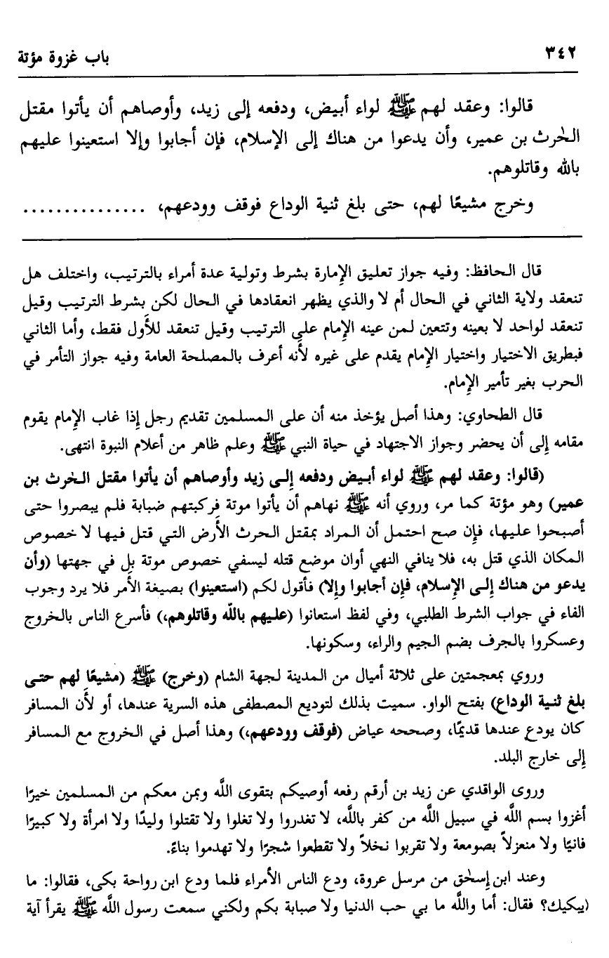 قال الحافظ: وفيه جواز تعليق الإمارة بشرط وتولية عدة أمراء بالترتيب، واختلف هل تنعقد ولاية الثاني في الحال أم لا والذي يظهر انعقادها في الحال لكن بشرط الترتيب وقيل: تنعقد لواحد لا بعينه وتتعين لمن عينه الإمام على الترتيب وقيل تنعقد للأول فقط، وأما الثاني فبطريق الاختيار واختيار الإمام يقدم على غيره لأنه أعرف بالمصلحة العامة وفيه جواز التآمر في الحرب بغير تأمير الإمام.