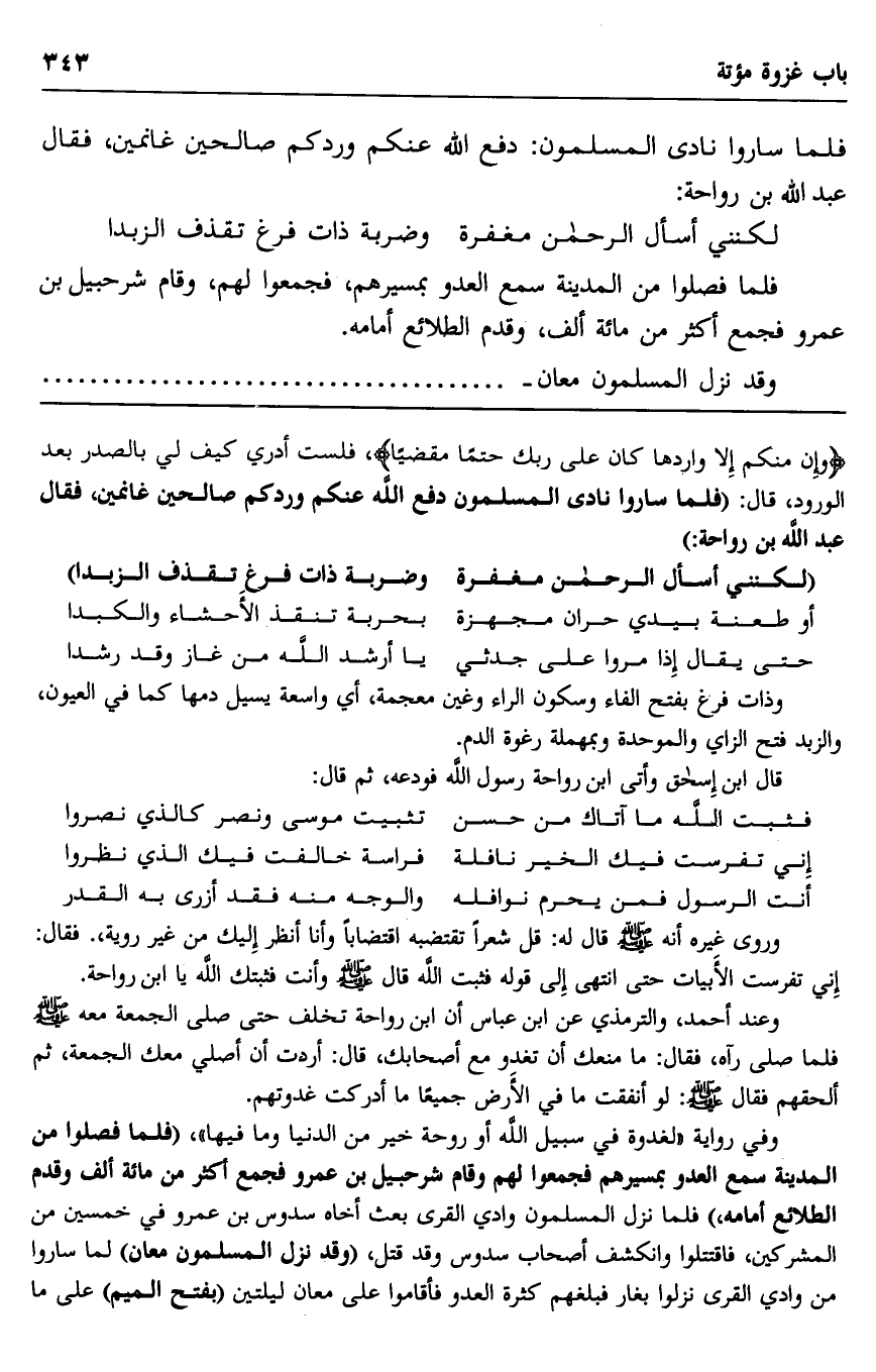 فلما ساروا نادى المسلمون: دفع الله عنكم وردكم صالحين غانمين، فقال عبد الله بن رواحة: