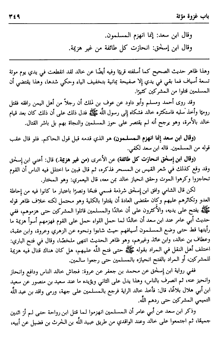 لكن قال الشامي وافق ابن إسحاق شرذمة فسمي فتحا ونصرا باعتبار ما كانوا فيه من إحاطة العدو وتكاثرهم عليهم وكان مقتضى العادة أن يقتلوا بالكلية وهو محتمل لكنه خلاف ظاهر قوله صلى الله عليه وسلم: "يفتح على يديه". والأكثرون على أن خالدا والمسلمين قاتلوا المشركين حتى هزموهم، ففي حديث أبي عامر عند ابن سعد أن خالدا لما حمل اللواء حمل على القوم فهزمهم أسوأ هزيمة ما رأيتها قط حتى وضع المسلمون أسيافهم حيث شاءوا ونحوه عن الزهري وعروة، وابن عقبة، وعطاف بن خالد، وابن عائذ وغيرهم، وهو ظاهر الحديث. انتهى ملخصا، وقال في فتح الباري: اختلف أهل النقل في المراد بقوله صلى الله عليه وسلم: "حتى فتح الله عليهم". هل كان هناك قتلا فيه هزيمة للمشركين، أو المراد بالفتح انحيازه بالمسلمين حتى رجعوا سالمين.