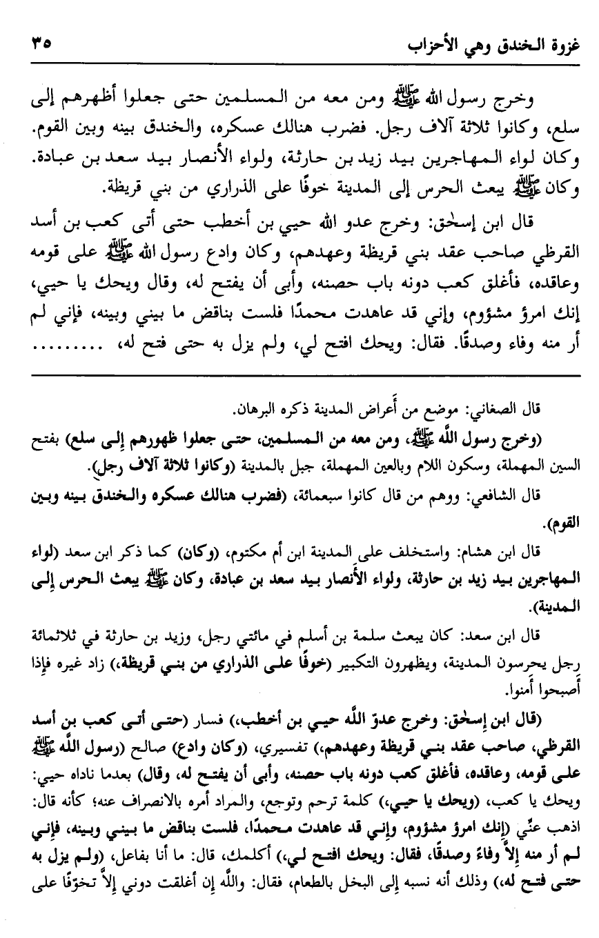 قال ابن إسحاق: وخرج عدو الله حيي بن أخطب" فسار "حتى أتى كعب بن أسد القرظي، صاحب عقد بني قريظة وعهدهم"، تفسيري، "وكان وادع" صالح "رسول الله صلى الله عليه وسلم على قومه، وعاقده فأغلق كعب دونه باب حصنه، وأبى أن يفتح له، وقال" بعدما ناداه حيي: ويحك يا كعب، "ويحك يا حيي"، كلمة ترحم وتوجع، والمراد أمره بالانصراف عنه، كأنه قال: اذهب عني "إنك امرؤ مشئوم، وإني قد عاهدت محمدا، فلست بناقض ما بيني وبينه، فإني لم أرم من إلا وفاء وصدقا فقال: ويحك افتح لي" أكلمك، قال: ما أنا بفاعل، "ولم يزل به حتى فتح له"، ذلك أنه نسبه إلى البخل بالطعام، والله إني أغلقت دوني إلا تخوفا على