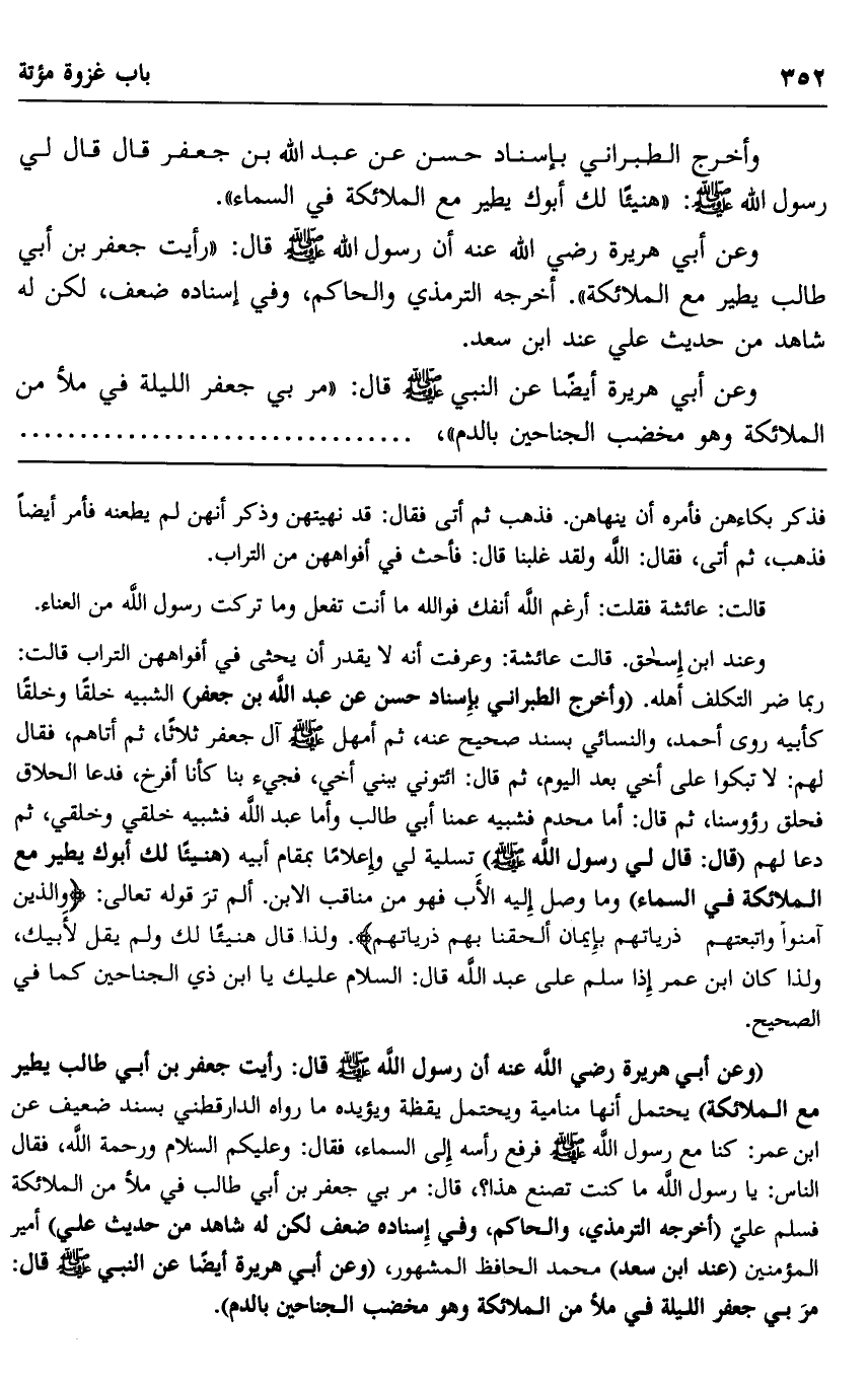 "وعن أبي هريرة رضي الله عنه أن رسول الله صلى الله عليه وسلم قال: "رأيت جعفر بن أبي طالب يطير مع الملائكة". يحتمل أنها منامية ويحتمل يقظة ويؤيده ما رواه الدارقطني بسند ضعيف عن ابن عمر: كنا مع رسول الله صلى الله عليه وسلم فرفع رأسه إلى السماء، فقال: وعليكم السلام ورحمة الله، فقال الناسك يا رسول الله ما كنت تصنع هذا؟ قال: مر بي جعفر بن أبي طالب في ملأ من الملائكة فسلم علي "أخرج الترمذي، والحاكم، وفي إسناده ضعف لكن له شاهد من حديث علي" أمير المؤمنين "عند ابن سعد" محمد الحافظ المشهور، "وعن أبي هريرة أيضا عن النبي صلى الله عليه وسلم قال: "مر بي جعفر الليلة في ملأ من الملائكة وهو مخضب الجناحين بالدم".