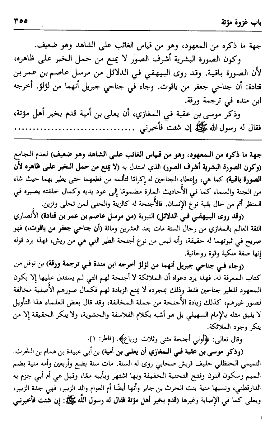 "وقد روى البيهقي في الدلائل" النبوية "من مرسل عاصم بن عمر بن قتادة" الأنصاري الثقة العالم بالمغازي من رجال الستة مات بعد العشرين ومائة "أن جناحي جعفر من ياقوت" فهو صريح في ثبوتهما له حقيقة، وأنه ليس من نوع أجنحة الطير التي هي من ريش، فهذا يرد قوله إنها صفة ملكية وقوة روحانية.