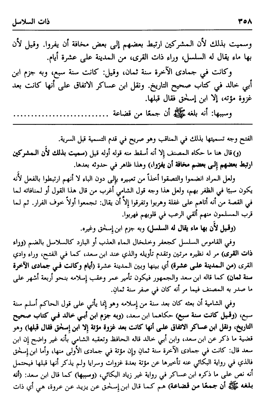 وفي الشامية أن بعثه كان بعد سنة من إسلامه وهو إنما يأتي على قول الحاكم أسلم سنة سبع، وقيل كانت سنة سبع" حكاهما ابن سعد، "وبه جزم ابن أبي خالد في كتاب صحيح التاريخ، ونقل ابن عساكر الاتفاق على أنها كانت بعد غزوة مؤتة إلا ابن إسحاق فقال: قبلها", وهو قضية ما ذكر عن ابن سعد، وابن أبي خالد قاله الحافظ وتعقبه الشامي بأنه غير واضح إن ابن سعد قال: كانت في جمادى الآخرة سنة ثمان وإن مؤتة في جمادى الأولى منها، وأما ابن إسحاق فالذي في رواية البكائي عنه تأخيرها عن مؤتة بعد غزوات وسرايا ولم يذكر أنها قبلها فيحتمل أنه نص على ما ذكره ابن عساكر في رواية غير زياد البكائي، "وسببها" كما قال ابن سعد: "أنه بلغه صلى الله عليه وسلم أن جمعا من قضاعة" هم كما قال ابن إسحاق عن يزيد عن عروة، هي أي ذات