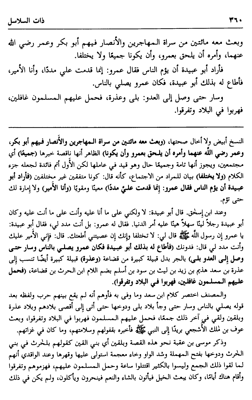 النسخ أبيض ولا أخال صحتها، "وبعث معه مائتين من سراة المهاجرين والأنصار فيهم أبو بكر، وعمر رضي الله عنهما وأمره أن يلحق بعمرو وأن يكونا" الظاهر أنها ناقصة خبرها "جميعا" أي مجتمعين، ويجوز أنها تامة وجميعا حال وهو قيد في عاملها لكن الأول أتم فائدة لجعله جزء الكلام "ولا يختلفا" بيان للمراد من الاجتماع، كأنه قال: كونا متفقين غير مختلفين "فأراد أبو عبيدة أن يؤم الناس فقال عمرو: إنما قدمت عليّ مددا" معينا ومقويا "وأنا الأمير" ولا إمارة لك حتى تؤم.