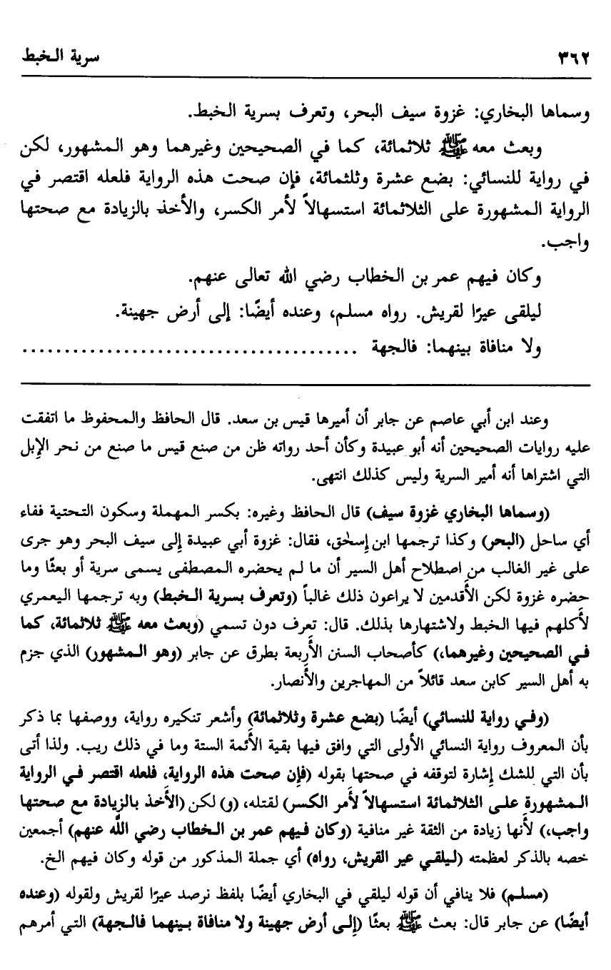 وعند ابن أبي عاصم عن جابر أن أميرها قيس بن سعد. قال الحافظ والمحفوظ ما اتفقت عليه روايات الصحيحين أنه أبو عبيدة وكأن أحد رواته ظن من صنع قيس ما صنع من نحر الإبل التي اشتراها أنه أمير السرية وليس كذلك. انتهى.