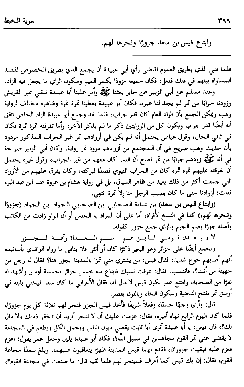 ويجمع أيضا على جزائر وهو البعير ذكرا كان أو أنثى فلا ينافي ما رواه الواقدي بأسانيده أنهم أصابهم جوع شديد، فقال قيس: من يشتري مني تمرا بالمدينة بجزر هنا؟ فقال له رجل من جهينة من أنت؟ فانتسب. فقال: عرفت نسبك. فابتاع منه خمس جزائر بخمسة أوسق وأشهد له نفرا من الصحابة، وامتنع عمر لكون قيس لا مال له، فقال الأعرابي: ما كان سعد ليخنى بابنه في أوسق تمر بفتح التحتية وسكون الخاء وبالنون يقصر.