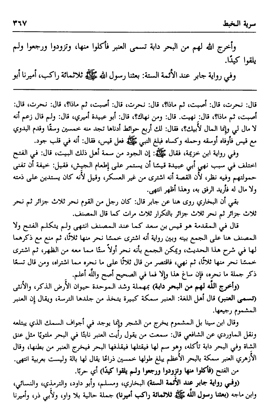 وفي رواية ابن خزيمة، فقال صلى الله عليه وسلم: "إن الجود من سمة أهل ذلك البيت". قال في الفتح: اختلف في سبب نهي أبي عبيدة قيسا أن يستمر على إطعام الجيش، فقيل: خيفة أن تفنى حمولتهم, وفيه نظر؛ لأن القصة أنه اشترى من غير العسكر، وقيل: لأنه كان يستدين على ذمته ولا مال له فأريد الرفق به، وهذا أظهر. انتهى.