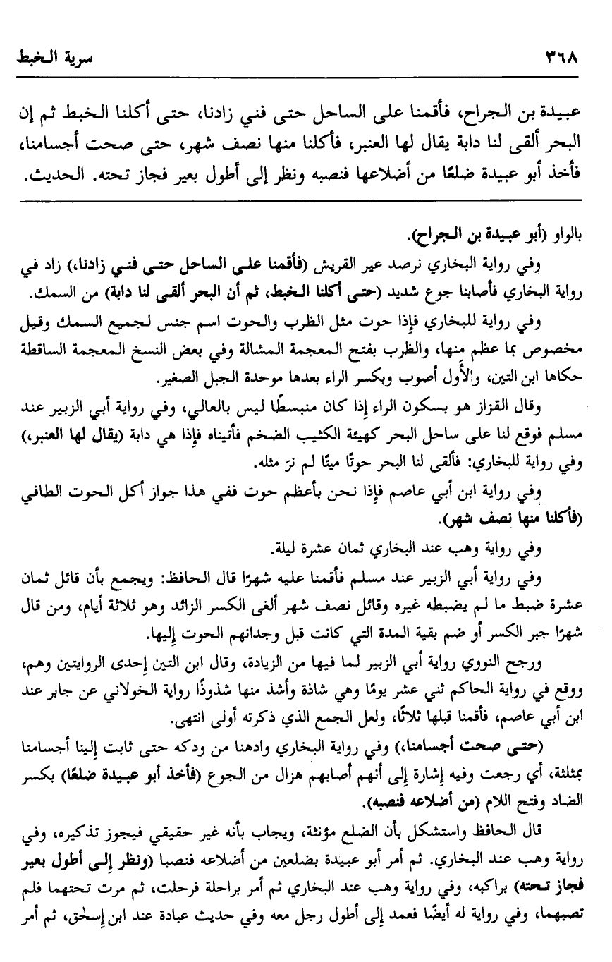 أبو عبيدة بن الجراح، فأقمنا على الساحل حتى فني زادنا، حتى أكلنا الخبط ثم إن البحر ألقى لنا دابة يقال لها: العنبر، فأكلنا منها نصف شهر، حتى صحت أجسامنا، فأخذ أبو عبيدة ضلعا من أضلاعها فنصبه ونظر إلى أطول بعير فجاز تحته. الحديث.