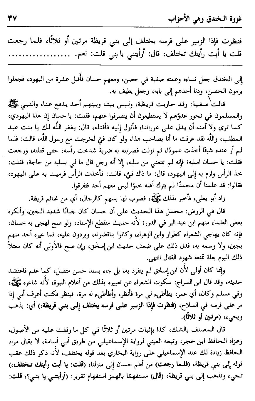 فنظرت فإذا الزبير على فرسه يختلف إلى بني قريظة مرتين أو ثلاثا، فلما رجعت قلت يا أبت رأيتك تختلف، قال: أرأيتني يا بني قلت: نعم