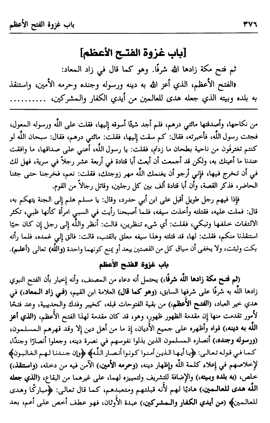 "ثم فتح مكة زادها الله شرفا", يحتمل أنه دعاء من المصنف، وأنه إخبار بأن الفتح النبوي زادها الله به شرفا على شرفها السابق، "وهو كما قال" العلامة ابن القيم، "في زاد المعاد" في هدي خير العباد: "الفتح الأعظم" من بقية الفتوحات قبله، كخيبر وفدك والحديبية، وعد فتحا لأمور تقدمت منها أن مقدمة الظهور ظهور، وهو قد كان مقدمة لهذا الفتح الأعظم، "الذي أعز الله به دينه", قواه وأظهره على جميع الأديان، إذ ما من أهل دين إلا وقد قهرهم المسلمون، "ورسوله وجنده" أنصاره المسلمون الذين بذلوا نفوسهم في نصرة دينه، وجعلوا أنصارا وجندا، كما في قوله تعالى: {يَا أَيُّهَا الَّذِينَ آمَنُوا كُونُوا أَنْصَارَ اللَّهِ} {وَإِنَّ جُنْدَنَا لَهُمُ الْغَالِبُونَ} لإخلاصهم في إعلاء كلمة الله وإظهار دينه، "وحرمه الأمين" الآمن فيه من دخله، "واستنقذ" خلص "به بلده وبيته"، والإضافة للتشريف ولتمييزه لهما على غيرهما من البقاع، "الذي جعله الله هدى للعالمين" هاديا لهم لأنه قبلتهم ومتعبدهم، كما قال تعالى: {مُبَارَكًا وَهُدًى لِلْعَالَمِينَ} "من أيدي الكفار والمشركين" عبدة الأوثان، فهو عطف أخص على أعم، بعد