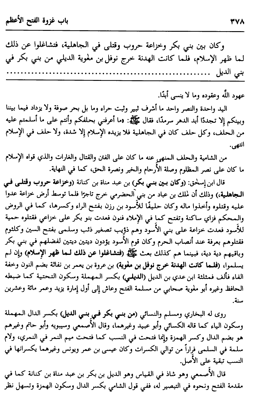قال ابن إسحاق: "وكان بيني بني بكر" بن عبد مناة بن كنانة "وخزاعة حروب وقتلى في الجاهلية" وذلك أن مالك بن عباد من بني الحضرمي خرج تاجرا فلما توسط أرض خزاعة عدوا عليه وقتلوه وأخذوا ماله وكان حليفا للأسود بن رزن بفتح الراء وكسرها، كما في الروض والمحكم فزاي ساكنة وتفتح كما في الإملاء فنون فعدت بنو بكر على خزاعي فقتلوه حمية للأسود فعدت خزاعة على بني الأسود وهم ذؤيب تصغير ذئب وسلمى بفتح السين وكلثوم فقتلوهم بعرفة عند أنصاب الحرم وكان قوم الأسود يؤدون ديتين لفضلهم في بني بكر وباقيهم دية دية، فبينما هم كذلك بعث صلى الله عليه وسلم "فتشاغلوا عن ذلك لما ظهر الإسلام" وإن لم يسلموا، "فلما كانت الهدنة خرج نوفل بن معاوية" بن عروة بن يعمر بن نفاثة بضم الون وخفة الفاء فألف فمثلثة ابن عدي بن الديل "الديلمي" بكسر المهملة وسكون التحتية كما ضبطه الحافظ وغيره أبو معاوية صحابي من مسلمة الفتح وعاش إلى أول إمارة يزيد وعمر مائة وعشرين سنة.