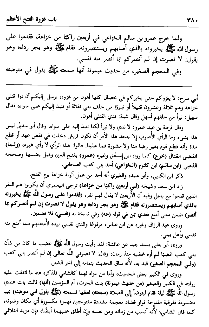 زاد ابن سعد وشيخه "في أربعين راكبا من خزاعة" ترجى اليعمري أن يكونوا هم النفر الذين قدموا مع بديل وفيه أن الأربعين لا يقال لهم: نفر، "فقدموا على رسول الله صلى الله عليه وسلم يخبرونه بالذي أصابهم ويستنصرونه فقام صلى الله عليه وسلم وهو يجر رداءه", وهو يقول: "لا نصرت إن لم أنصركم بما أنصر" ضمن معنى أمنع فعدي بمن في قوله "منه" وفي نسخة به "نفسي" فلا تضمين.