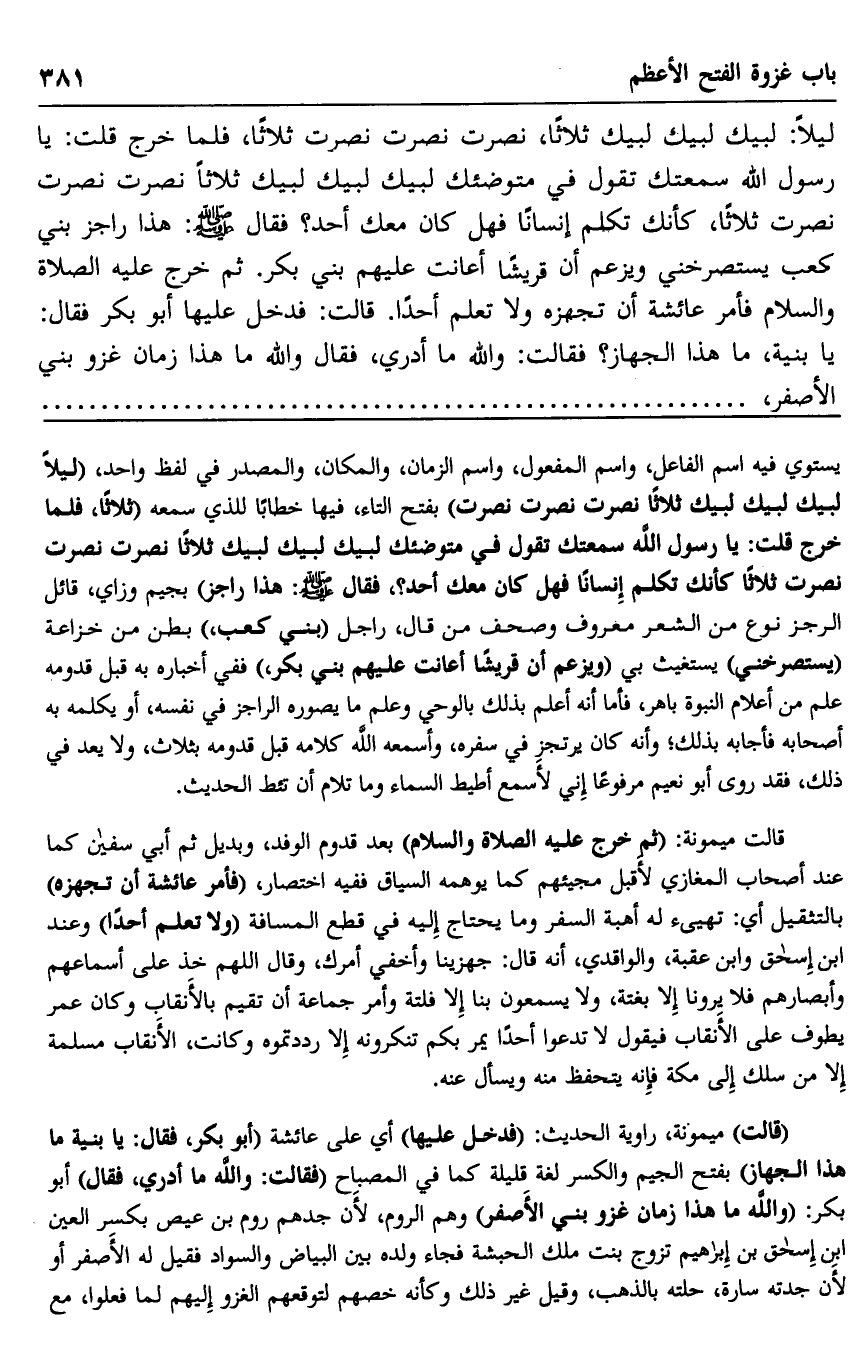 يستوي فيه اسم الفاعل، واسم المفعول، واسم الزمان، والمكان، والمصدر في لفظ واحد، ليلا: "لبيك لبيك لبيك -ثلاثا- نصرت نصرت نصرت". بفتح التاء، فيها خطابا للذي سمعه "ثلاثا، فلما خرج قلت: يا رسول الله سمعتك تقول في متوضئك: "لبيك لبيك لبيك -ثلاثا- نصرت نصرت نصرت -ثلاثا". كأنك تكلم إنسانا فهل كان معك أحد؟ " فقال صلى الله عليه وسلم: "هذا راجز" بجيم وزاي، قائل الرجز نوع من الشعر معروف وصحف من قال، راجل "بني كعب" بطن من خزاعة "يستصرخني" يستغيث بي "ويزعم أن قريشا أعانت عليهم بني بكر" ففي إخباره به قبل قدومه علم من أعلام النبوة باهر، فأما أنه أعلم بذلك بالوحي وعلم ما يصوره الراجز في نفسه، أو يكلمه به أصحابه فأجابه بذلك، وأنه كان يرتجز في سفره، وأسمعه الله كلامه قبل قدومه بثلاث، ولا يعد في ذلك، فقد روى أبو نعيم مرفوعا: "إني لأسمع أطيط السماء وما تلام أن تئط". الحديث.