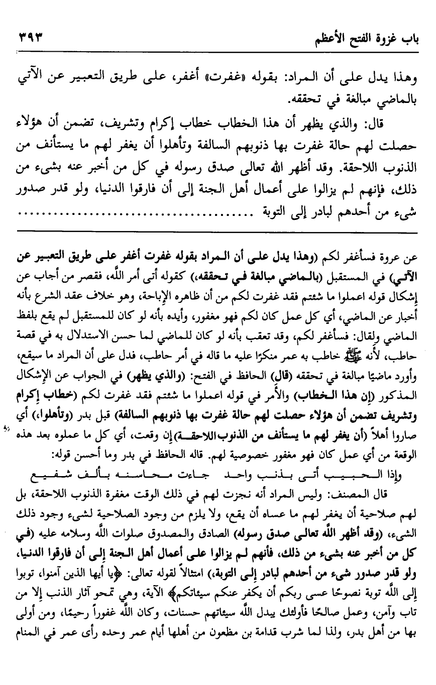 عن عروة: "فسأغفر لكم". "وهذا يدل على أن المراد بقوله: غفرت: أغفر على طريق التعبير عن الآتي" في المستقبل "بالماضي مبالغة في تحققه", كقوله: {أَتَى أَمْرُ اللَّهِ} ، فقصر من أجاب عن إشكال قوله: "اعملوا ما شئتم فقد غفرت لكم". من أن ظاهره الإباحة، وهو خلاف عقد الشرع بأنه إخبار عن الماضي، أي كل عمل كان لكم فهو مغفور، وأيده بأنه لو كان للمستقبل لم يقع بلفظ الماضي ولقال: فسأغفر لكم، وقد تعقب بأنه لو كان للماضي لما حسن الاستدلال به في قصة حاطب؛ لأنه صلى الله عليه وسلم خاطب به عمر منكرا عليه ما قاله في أمر حاطب، فدل على أن المراد ما سيقع، وأورد ماضيا مبالغة في تحققه "قال" الحافظ في الفتح: "والذي يظهر" في الجواب عن الإشكال المذكور "أن هذا الخطاب" والأمر في قوله: "اعملوا ما شئتم فقد غفرت لكم". "خطاب إكرام وتشريف تضمن أن هؤلاء حصلت لهم حالة غفرت بها ذنوبهم السالفة" قبل بدر "وتأهلوا" أي: صاروا أهلا "أن يغفر لهم ما يستأنف من الذنوب اللاحقة" إن وقعت، أي كل ما عملوه بعد هذه الوقعة من أي عمل كان فهو مغفور خصوصية لهم. قاله الحافظ في بدر وما أحسن قوله:
