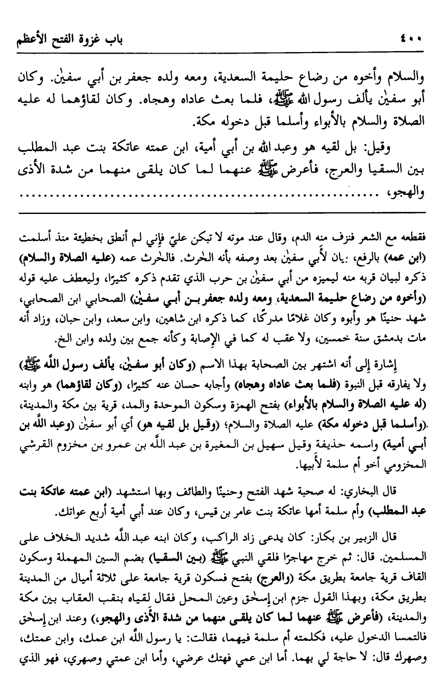 والسلام وأخوه من رضاع حليمة السعدية، ومعه ولده جعفر بن أبي سفيان. وكان أبو سفيان يألف رسول الله صلى الله عليه وسلم، فلما بعث عاداه وهجاه. وكان لقاؤهما له عليه الصلاة والسلام بالأبواء وأسلما قبل دخوله مكة.