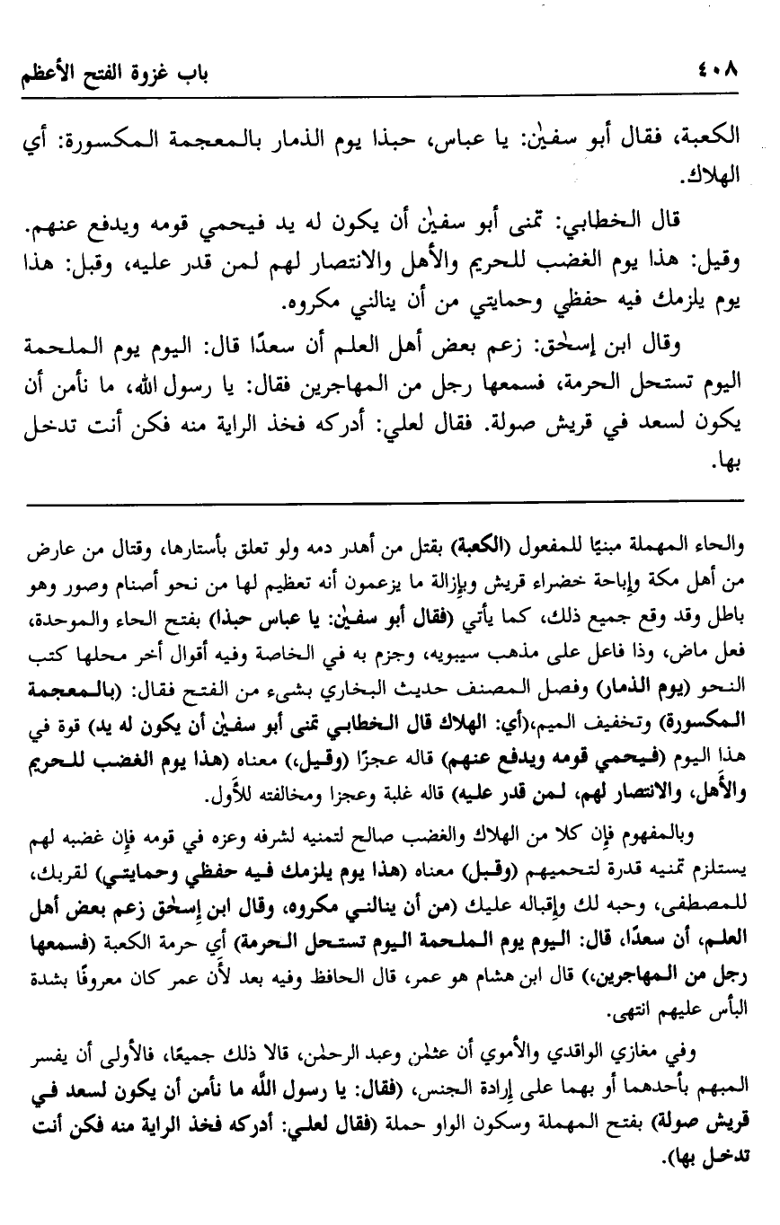 والحاء المهملة مبنيا للمفعول "الكعبة" بقتل من أهدر دمه ولو تعلق بأستارها، وقتال من عارض من أهل مكة وإباحة خضراء قريش وبإزالة ما يزعمون أنه تعظيم لها من نحو أصنام وصور وهو باطل وقد وقع جميع ذلك، كما يأتي "فقال أبو سفيان: يا عباس حبذا" بفتح الحاء والموحدة، فعل ماض، وذا فاعل على مذهب سيبويه، وجزم به في الخاصة وفيه أقوال أخر محلها كتب النحو "يوم الذمار" وفصل المصنف حديث البخاري بشيء من الفتح فقال: "بالمعجمة المكسورة" وتخفيف الميم، "أي: الهلاك, قال الخطابي: تمنى أبو سفيان أن يكون له يد" قوة في هذا اليوم "فيحمي قومه ويدفع عنهم" قاله عجزا "وقيل": معناه "هذا يوم الغضب للحريم والأهل، والانتصار لهم، لمن قدر عليه" قاله غلبة وعجزا ومخالفته للأول.