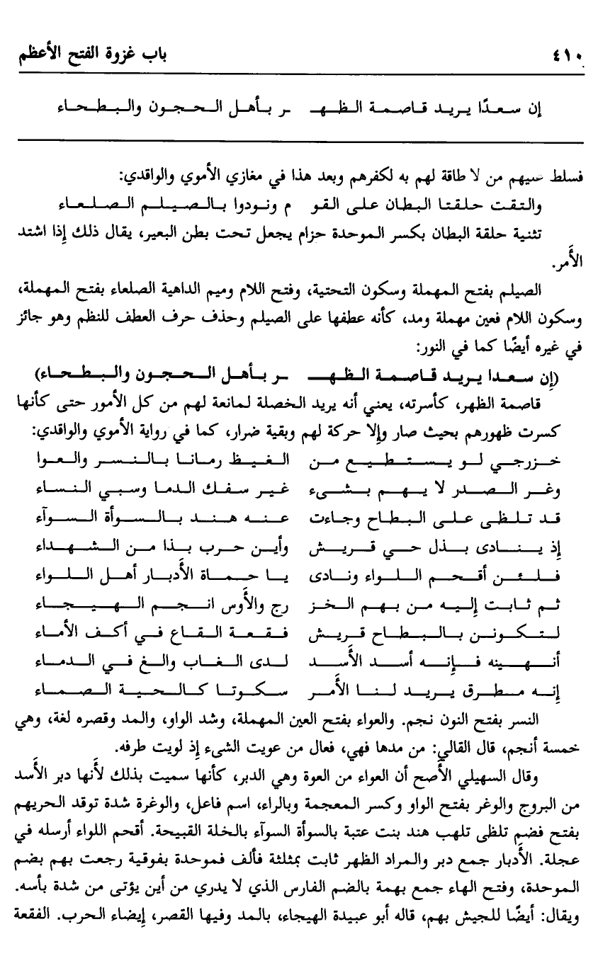 وقال السهيلي الأصح أن العواء من العوة وهي الدبر، كأنها سميت بذلك لأنها دبر الأسد من البروج والوغر بفتح الواو وكسر المعجمة وبالراء، اسم فاعل، والوغرة شدة توقد الحريهم بفتح فضم تلظى تلهب هند بنت عتبة بالسوأة السوآء بالخلة القبيحة. أقحم اللواء أرسله في عجلة. الأدبار جمع دبر والمراد الظهر ثابت بمثلثة فألف فموحدة بفوقية رجعت بهم بضم الموحدة، وفتح الهاء جمع بهمة بالضم الفارس الذي لا يدري من أين يؤتى من شدة بأسه.