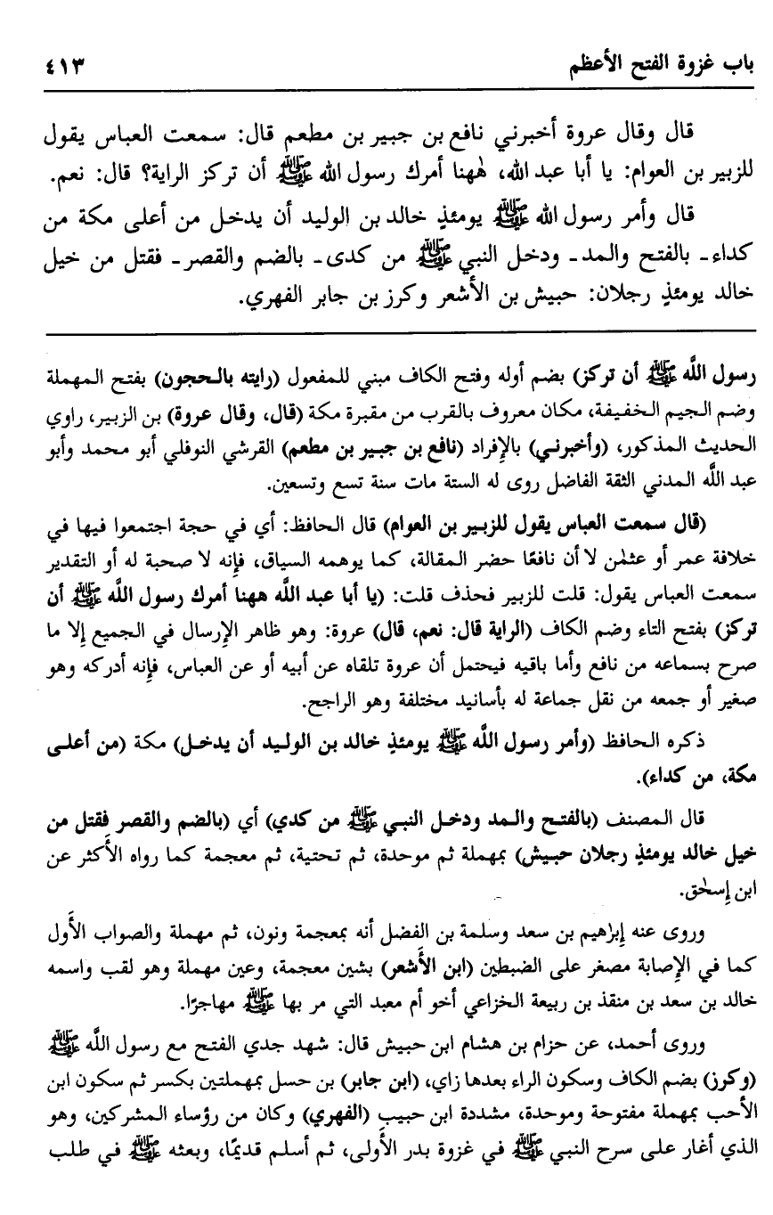 قال: وقال عروة: أخبرني نافع بن جبير بن مطعم قال: سمعت العباس يقول للزبير بن العوام: يا أبا عبد الله، ههنا أمرك رسول الله صلى الله عليه وسلم أن تركز الراية؟ قال: نعم.