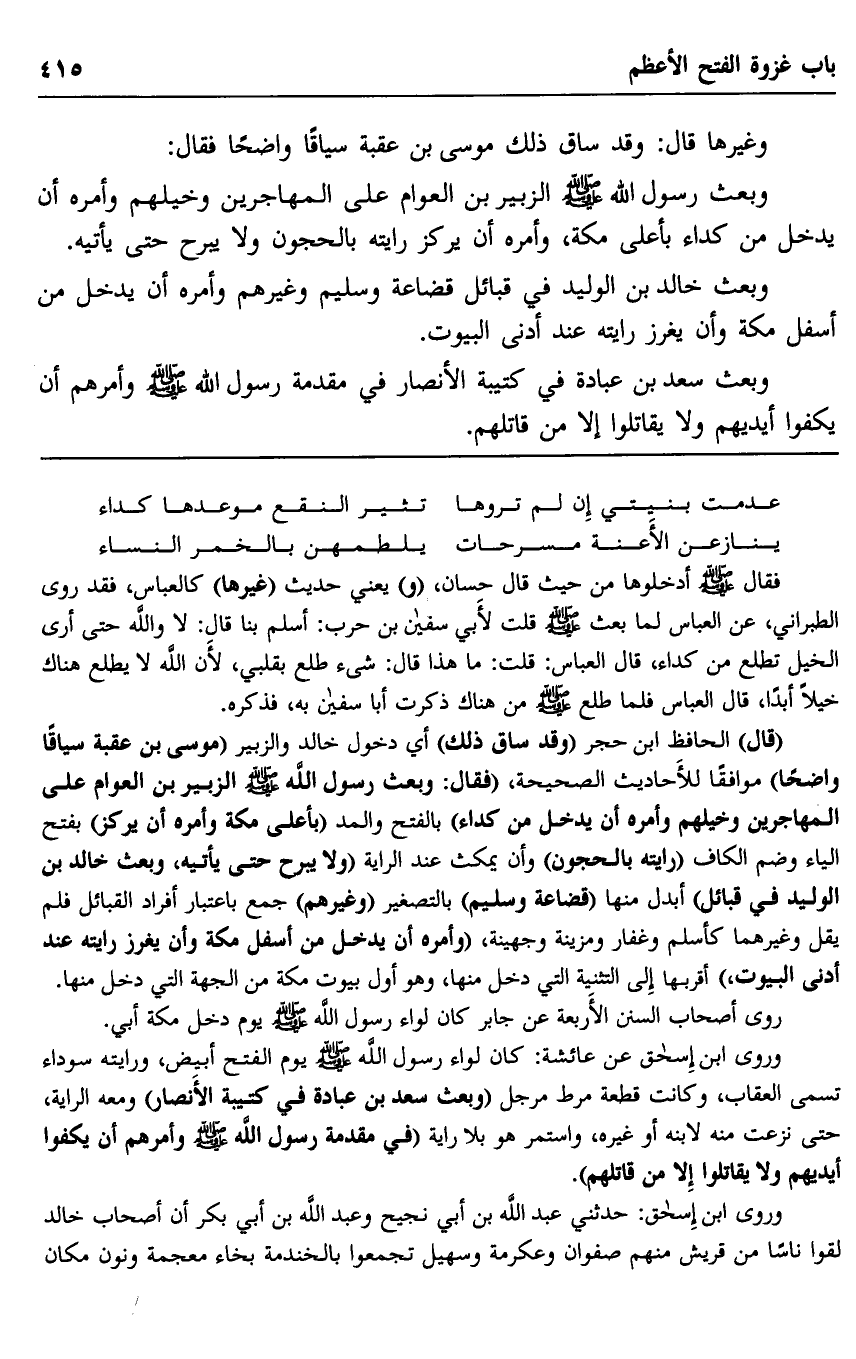 "قال" الحافظ ابن حجر "وقد ساق ذلك" أي دخول خالد والزبير "موسى بن عقبة سياقا واضحا" موافقا للأحاديث الصحيحة، "فقال: وبعث رسول الله صلى الله عليه وسلم الزبير بن العوام على المهاجرين وخيلهم وأمره أن يدخل من كداء" بالفتح والمد "بأعلى مكة وأمره أن يركز" بفتح الياء وضم الكاف "رايته بالحجون" وأن يمكث عند الراية "ولا يبرح حتى يأتيه، وبعث خالد بن الوليد في قبائل" أبدل منها "قضاعة وسليم" بالتصغير "وغيرهم" جمع باعتبار أفراد القبائل فلم يقل وغيرهما كأسلم وغفار ومزينة وجهينة، "وأمره أن يدخل من أسفل مكة وأن يغرز رايته عند أدنى البيوت" أقربها إلى الثنية التي دخل منها، وهو أول بيوت مكة من الجهة التي دخل منها.