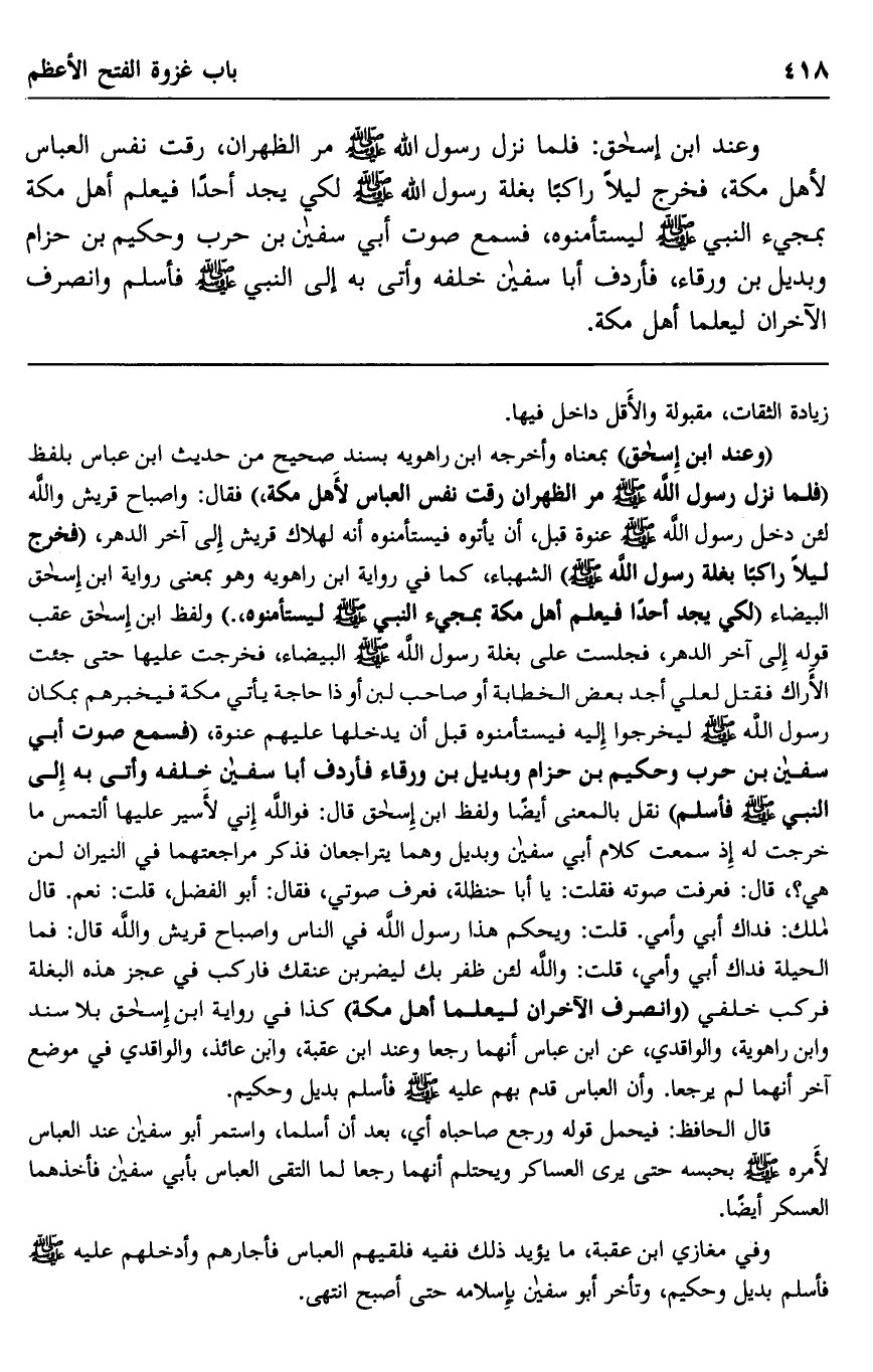 "وعند ابن إسحاق" بمعناه وأخرجه ابن راهويه بسند صحيح من حديث ابن عباس بلفظ "فلما نزل رسول الله صلى الله عليه وسلم مر الظهران رقت نفس العباس لأهل مكة", فقال: واصباح قريش والله لئن دخل رسول الله صلى الله عليه وسلم عنوة قبل، أن يأتوه فيستأمنوه أنه لهلاك قريش إلى آخر الدهر، "فخرج ليلا راكبا بغلة رسول الله صلى الله عليه وسلم"الشهباء، كما في رواية ابن راهويه وهو بمعنى رواية ابن إسحاق البيضاء "لكي يجد أحدًا فيعلم أهل مكة بمجيء النبي صلى الله عليه وسلم ليستأمنوه", ولفظ ابن إسحاق عقب قوله إلى آخر الدهر، فجلست على بغلة رسول الله صلى الله عليه وسلم البيضاء، فخرجت عليها حتى جئت الأراك فقتل لعلي أجد بعض الخطابة أو صاحب لبن أو ذا حاجة يأتي مكة فيخبرهم بمكان رسول الله صلى الله عليه وسلم ليخرجوا إليه فيستأمنوه قبل أن يدخلها عليهم عنوة، "فسمع صوت أبي سفيان بن حرب وحكيم بن حزام وبديل بن ورقاء فأردف أبا سفيان خلقه وأتي بي إلى النبي صلى الله عليه وسلم فأسلم" نقل بالمعنى أيضا ولفظ ابن إسحاق قال: فوالله إني لأسير ليها ألتمس ما خرجت له إذ سمعت كلام أبي سفيان وبديل وهما يتراجعان فذكر مراجعتهما في النيران لمن هي؟ قال: فعرفت صوته فقتل: يا أبا حنظلة، فعرف صوتي، فقال: أبو الفضل، قلت: نعم. قال مالك: فداك أبي وأمي. قلت: ويحكم هذا رسول الله في الناس واصباح قريش والله قال: فما الحيلة فداك أبي وأمي، قلت: والله لئن ظفر بك ليضربن عنقك فاركب في عجز هذه البغلة فركب خلفي "وانصرف الآخران ليعلم أهل مكة " كذا في رواية ابن إسحاق بلا سند وابن راهويه، والواقدي، عن ابن عباس أنهما رجعا وعند ابن عقبة، وابن عائذ، والواقدي في موضع آخر أنهما لم يرجعا. وأن العباس قدم بهم عليه صلى الله عليه وسلم فأسلم بديل وحكيم.