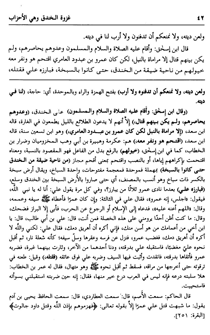 "وقال ابن إسحاق: وأقام عليه الصلاة والسلام والمسلمون" على الخندق، "وعدوهم يحاصرهم، ولم يكن بينهم قتال،" إلا أنهم لا يدعون الطلائع بالليل يطمعون في الغارة، قاله ابن سعد، "اقتحم هو ونفر معه" هم: عكرمة وهبيرة بن أبي وهب المخزوميان وضرار بن الخطاب، كما في ابن إسحاق "خيولهم" بالرفع بدل من الفاعل فهو المقصود بالنسبة، ومعناه اقتحمت بإكراههم إياها، أو بالنصب واقتحم بمعنى أقحم مجاز "من ناحية ضيقة من الخندق حتى كانوا بالسبخة" بمهملة فموحدة فمعجمة مفتوحات، واحدة السباخ، ويقال أرض سبخة بالكسر ذات سباخ وهو أنسب بالمصنف، أي: حتى صاروا بالأرض السبخة بين الخندق وسلع، "فبارزه علي" بعدما نادى عمرو ثلاثا من يبازر؟ وفي كل مرة يقول علي: أنا له يا نبي الله، فيقول: "اجلس، إنه عمرو"، فقال علي في الثالثة: وإن كان عمرا فأعطاه صلى الله عليه وسلم سيفه وعممه، وقال: "اللهم أعنه عليه"، فدعاه إلى الإسلام أو الرجوع عن الحرب، فأبى إلا البراز فضحك، وقال: ما كنت أظن أحدا يرومني على هذه الخصلة فمن أنت، قال: علي بن أبي طالب، قال: يابن أخي من أعمامك من هو أسن منك، فإني أكره أن أهريق دمك، فقال علي: لكني والله لا أكره أن أهريق دمك فغضب عمرو، فنزل عن فرسه وعقرها وسل سيفه، كأنه شعلة نار، ثم أقبل نحوه علي مغضبا, فاستقبله على بدرقته ودنا أحدهما من الآخر، وثارت بينهما غبرة فضربه عمرو فاتقاها بدرقته، فانقدت وأثبت فيها السيف وضربه علي فوق عاتقه "فقتله" وقيل: طعنه في ترقوته حتى أخرجها من مراقه فسقط ثم أقبل نحوه صلى الله عليه وسلم وهو متهال، فقال له عمر بن الخطاب: هلا سلبته درعه فإنه ليس في العرب درع خير منها، فقال: إنه حين ضربته استقبلني بسوأته فاستحييت.
