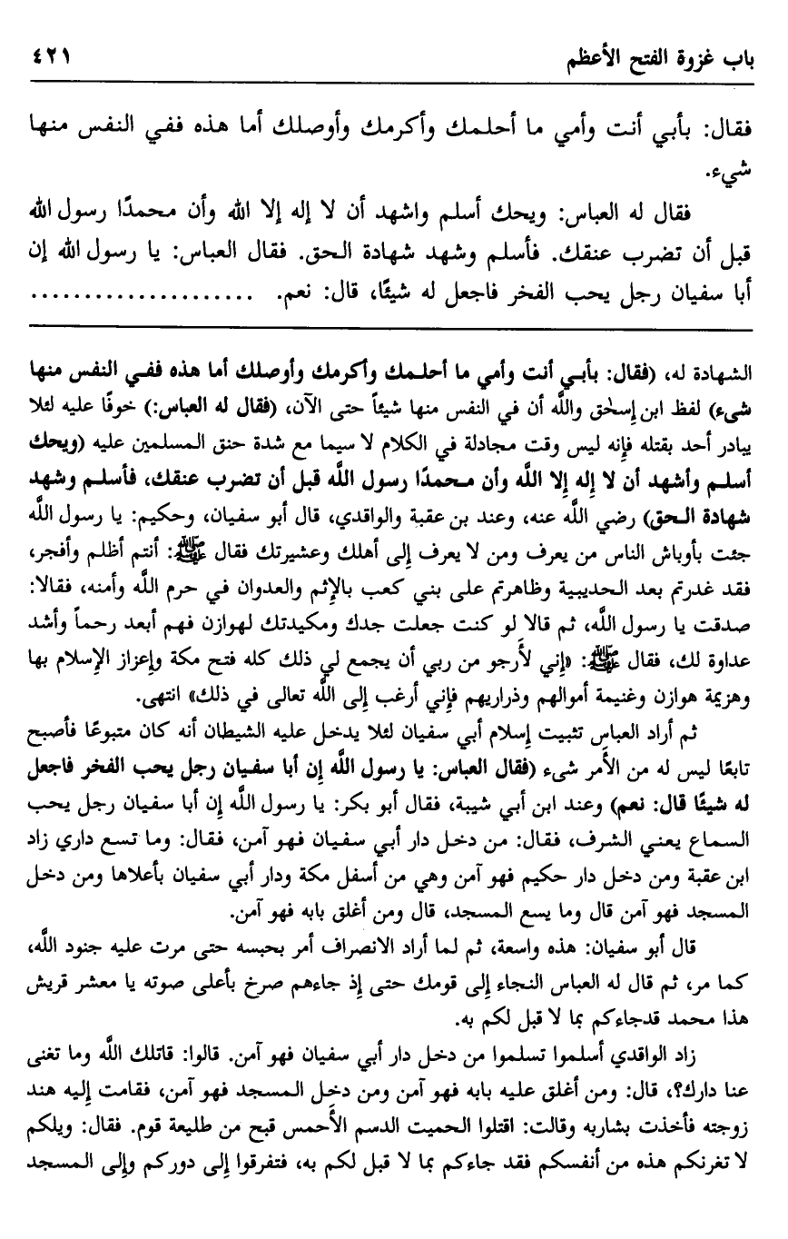 فقال له العباس: ويحك أسلم واشهد أن لا إله إلا الله وأن محمدًا رسول الله قبل أن تضرب عنقك. فأسلم وشهد شهادة الحق. فقال العباس: يا رسول الله إن أبا سفيان رجل يحب الفخر فاجعل له شيئا، قال: "نعم".