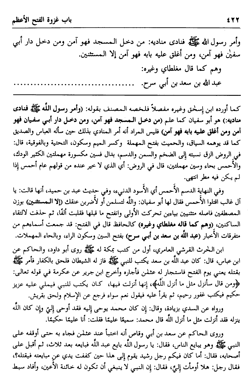 وفي النهاية الدسم الأحمس أي الأسود الدنيء، وفي حديث عبد بن حميد، أنها قالت: يا آل غالب اقتلوا الأحمس فقال لها أبو سفيان: والله لتسلمن أو لأضربن عنقك "إلا المستثنين" بوزن المصطفين فاصله متثنيين بياءين تحركت الأولى وانفتح ما قبلها فقلبت ألفا، ثم حذفت لالتقاء الساكنين، "وهم كما قاله مغلطاي وغيره" كالحافظ قال في الفتح: قد جمعت أسماءهم من متفرقات الأخبار "عبد الله بن سعد بن أبي سرح" بفتح السين وسكون الراء، وبالحاء المهملات. ابن الحارث القرشي العامري، أول من كتب بمكة له صلى الله عليه وسلم روى أبو داود، والحاكم عن ابن عباس، قال: كان عبد الله بن سعد يكتب للنبي صلى الله عليه وسلم فأزله الشيطان فلحق بالكفار فأمر صلى الله عليه وسلم بقتله يعني يوم الفتح فاستجار له عثمان فأجاره أخرج ابن جرير عن عكرمة في قوله تعالى: {وَمَنْ قَالَ سَأُنْزِلُ مِثْلَ مَا أَنْزَلَ اللَّهُ} ، إنها أنزلت فيها، كان يكتب للنبي فيملي عليه عزيز حكيم فيكتب غفور رحيم، ثم يقرأ عليه فيقول نعم سواء فرجع عن الإسلام ولحق بقريش.
