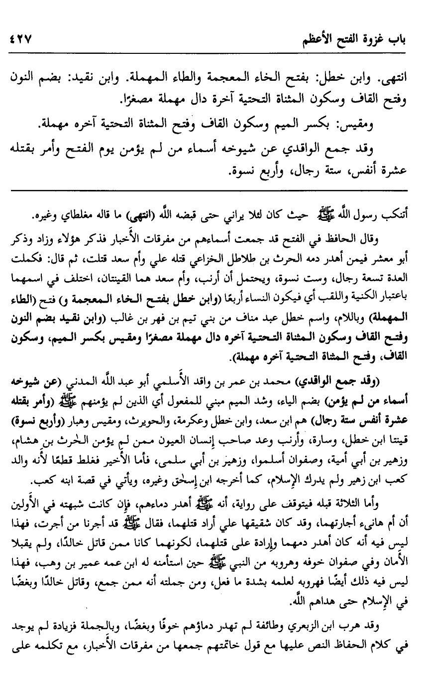 وقال الحافظ في الفتح قد جمعت أسماءهم من مفرقات الأخبار فذكر هؤلاء وزاد وذكر أبو معشر فيمن أهدر دمه الحارث بن طلاطل الخزاعي قتله علي وأم سعد قتلت، ثم قال: فكملت العدة تسعة رجال، وست نسوة، ويحتمل أن أرنب، وأم سعد هما القينتان، اختلف في اسمهما باعتبار الكنية واللقب أي فيكون النساء أربعا "وابن خطل بفتح الخاء المعجمة" وفتح "الطاء المهملة" وباللام، واسم خطل عبد مناف من بني تيم بن فهر بن غالب "وابن نقيد بضم النون وفتح القاف وسكون المثناة التحتية آخره دال مهملة مصغرا ومقيس بكسر الميم، وسكون القاف، وفتح المثناة التحتية آخره مهملة".