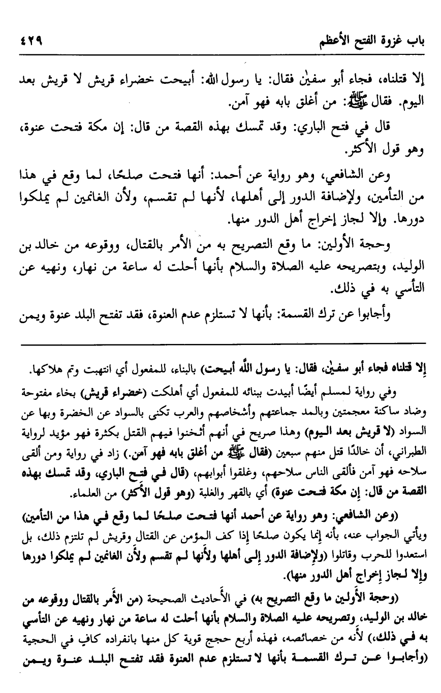 "وعن الشافعي: وهو رواية عن أحمد أنها فتحت صلحا لما وقع في هذا من التأمين" ويأتي الجواب عنه، بأنه إنما يكون صلحا إذا كف المؤمن عن القتال وقريش لم تلتزم ذلك، بل استعدوا للحرب وقاتلوا "ولإضافة الدور إلى أهلها ولأنها لم تقسم ولأن الغانمين لم يملكوا دورها وإلا لجاز إخراج أهل الدور منها".