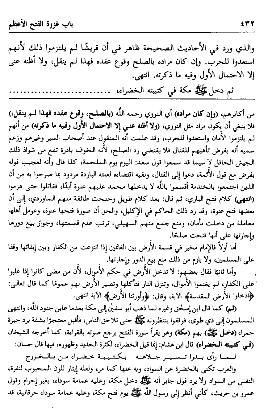من أكابرهم، "وإن كان مراده" أي النووي رحمه الله "بالصلح، وقوع عقده فهذا لم ينقل", فلا ينبغي أن يكون مراد مثل النووي، "ولا أظنه عني إلا الاحتمال الأول وفيه ما ذكرته" من أنهم لم يلتزموا الأمان واستعدوا للحرب، وقد علمت أنه المنقول عند أصحاب السير وغيرهم وزعم سميه أنه بفرض تأهبهم للقتال فلا يقتضي رد الصلح؛ لأنه الخوف بادرة تقع من شواذ ذلك الجيش الحافل لا سيما قد سمعوا قول سعد: اليوم يوم الملحمة، كذا قال وإنه لعجيب قوله بفرض مع قول الأئمة، دعوا إلى القتال، ونفيه اقتضاءه لعلته الباردة مردود بما صرحوا به من أن الذين اجتمعوا بالخندمة أقسموا بالله لا يدخلها محمد عليهم عنوة أبدا، فقاتلوا حتى هزموا "انتهى" كلام فتح الباري، ثم قال بعد كلام طويل وجنحت طائفة منهم الماوردي إلى أن بعضها فتح عنوة، وقد رد ذلك الحاكم في الإكليل، والحق أن صورة فتحها عنوة، وعومل أهلها معاملة من دخلت بأمان، ومنع جمع منهم السهيلي، ترتب عدم قسمتها، وجواز بيع دورها وإجارتها على أنها فتحت صلحا.