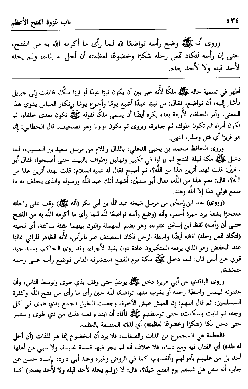 وروي أنه صلى الله عليه وسلم وضع رأسه تواضعا لله لما رأى ما أكرمه الله به من الفتح، حتى إن رأسه لتكاد تمس رحله شكرا وخضوعا لعظمته أن أحل له بلده، ولم يحله لأحد قبله ولا لأحد بعده.