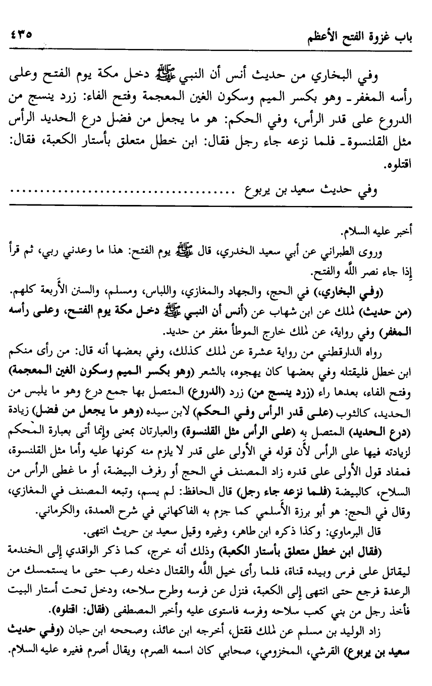 وفي البخاري من حديث أنس أن النبي صلى الله عليه وسلم دخل مكة يوم الفتح وعلى رأسه المغفر -وهو بكسر الميم وسكون الغين المعجمة وفتح الفاء: زرد ينسج من الدروع على قدر الرأس، وفي الحكم: هو ما يجعل من فضل درع الحديد الرأس مثل القلنسوة- فلما نزعه جاء رجل فقال: ابن خطل متعلق بأستار الكعبة، فقال: "اقتلوه".